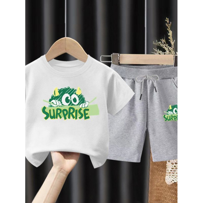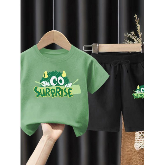 安哼安哼綠怪獸男童夏季休閒運動套裝2025中小童純棉短袖T恤五分