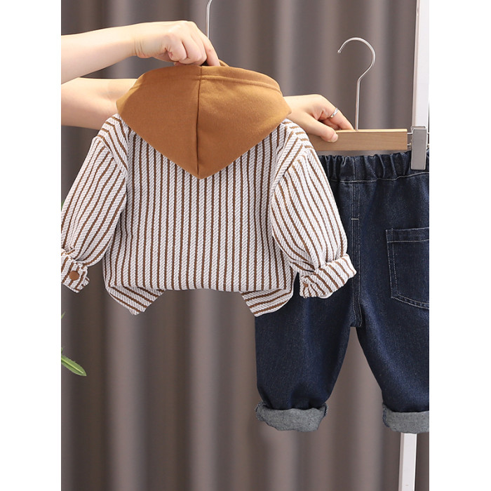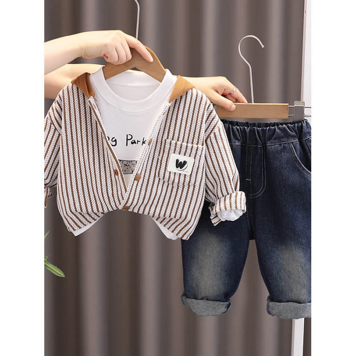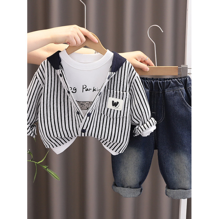 新款兒童春秋季條紋帽衫外套時尚簡約套裝男童外穿外出服三件套潮
