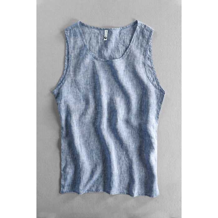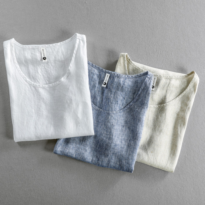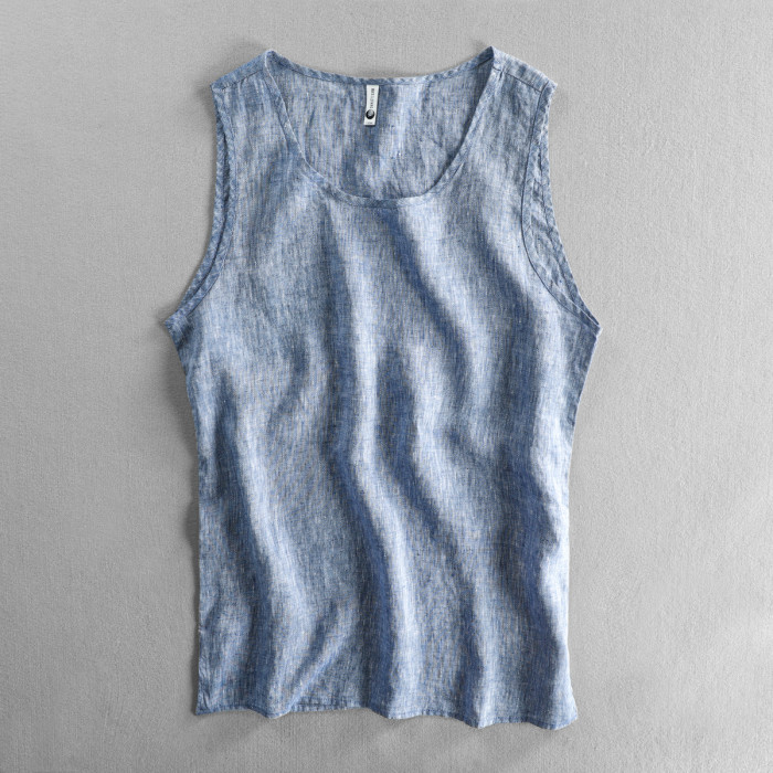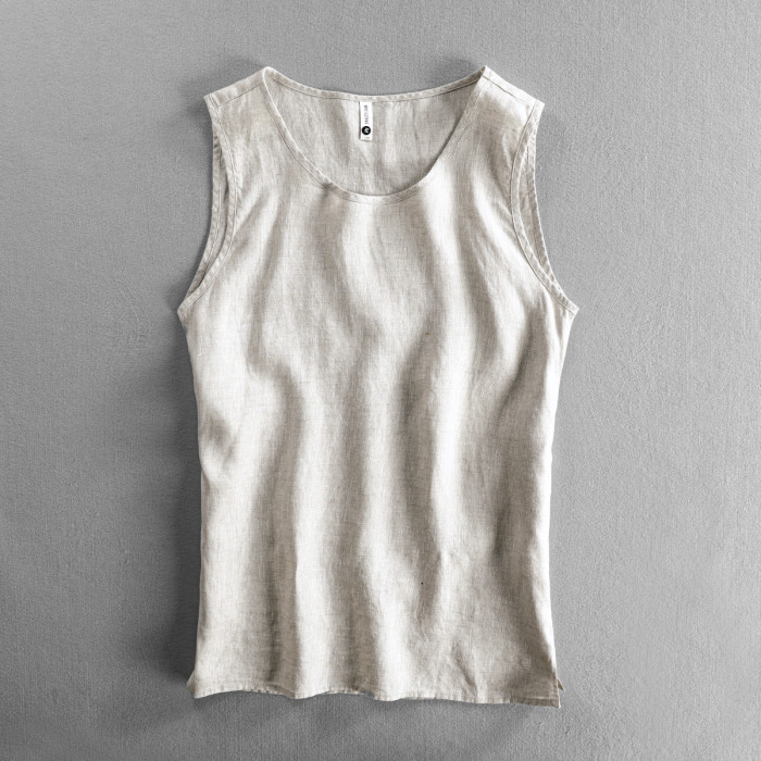 香港夏季男休閒純亞麻T恤無袖寬松純色背心薄款涼爽純麻料汗背心