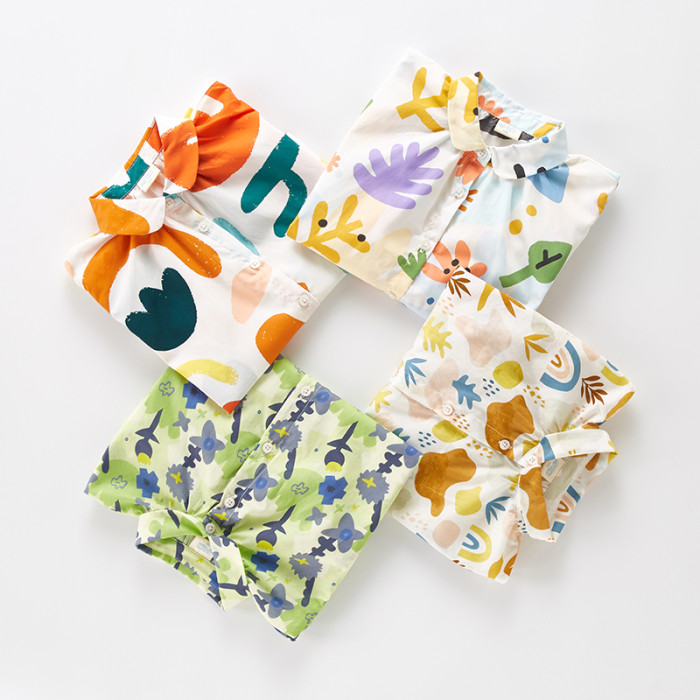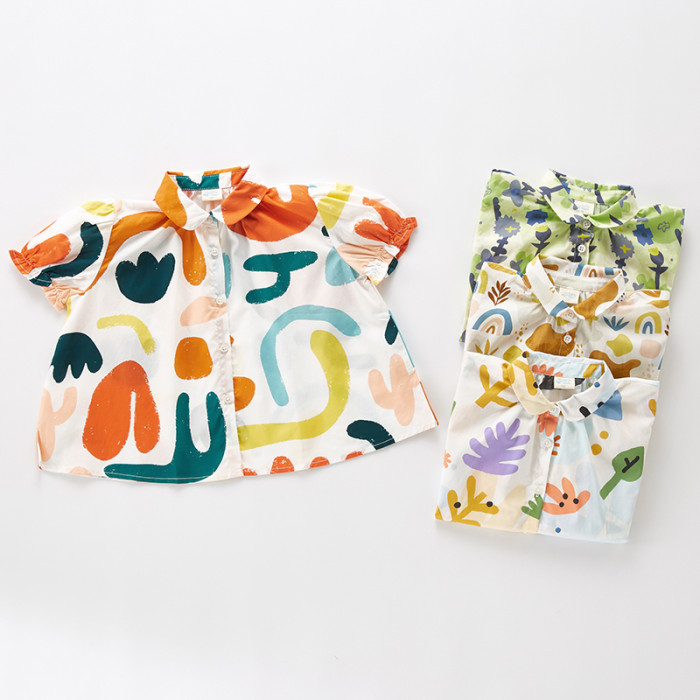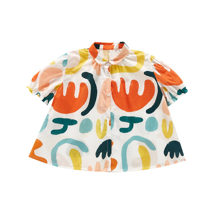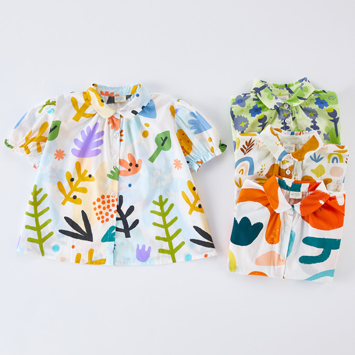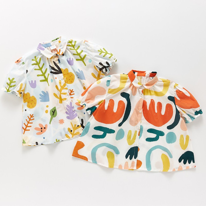 短袖襯衫女童夏兒童純棉襯衣泡泡袖薄款印花短款法式上衣洋氣t恤