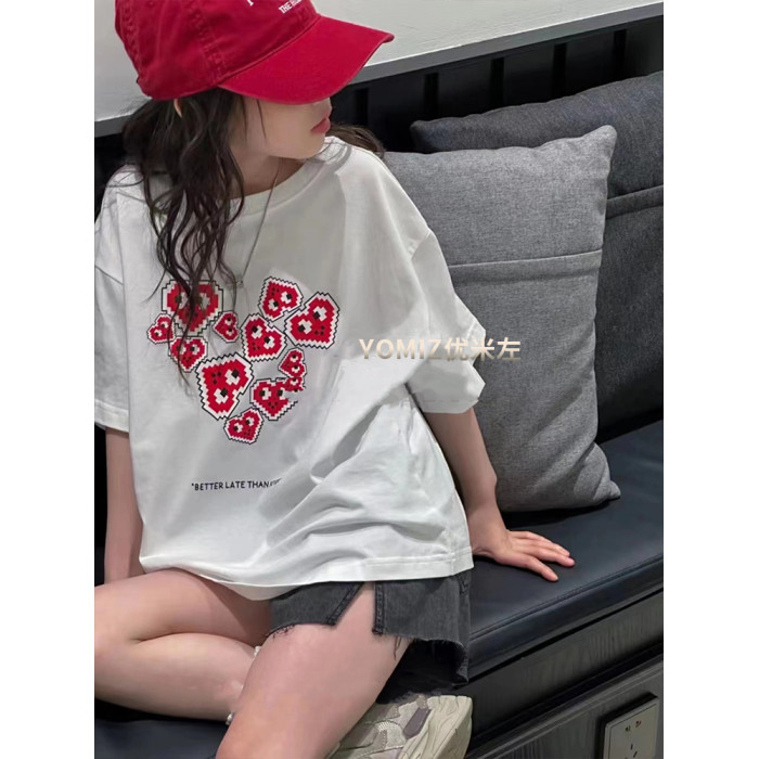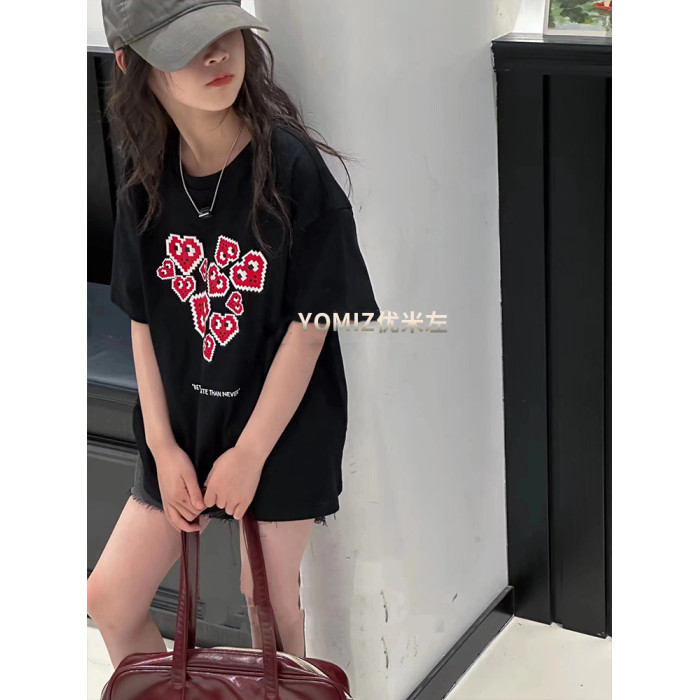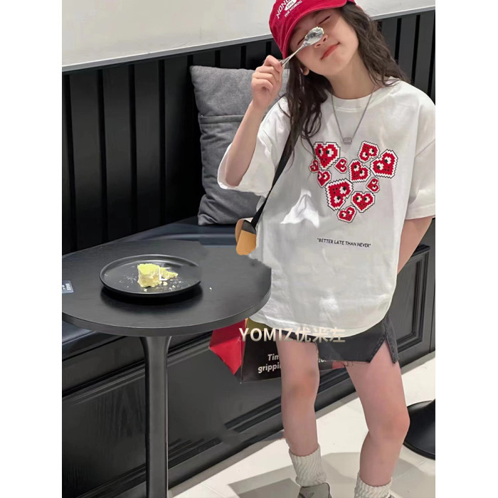 波拉bora韓國童裝女童笑臉愛心短袖T恤2025春夏時髦兒童寬松上衣