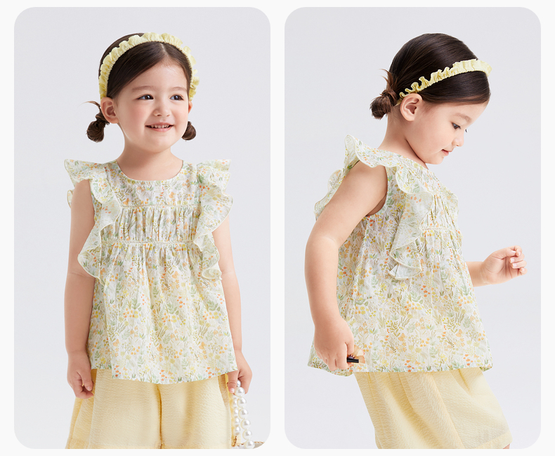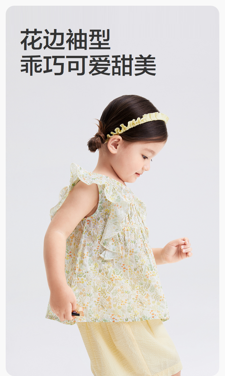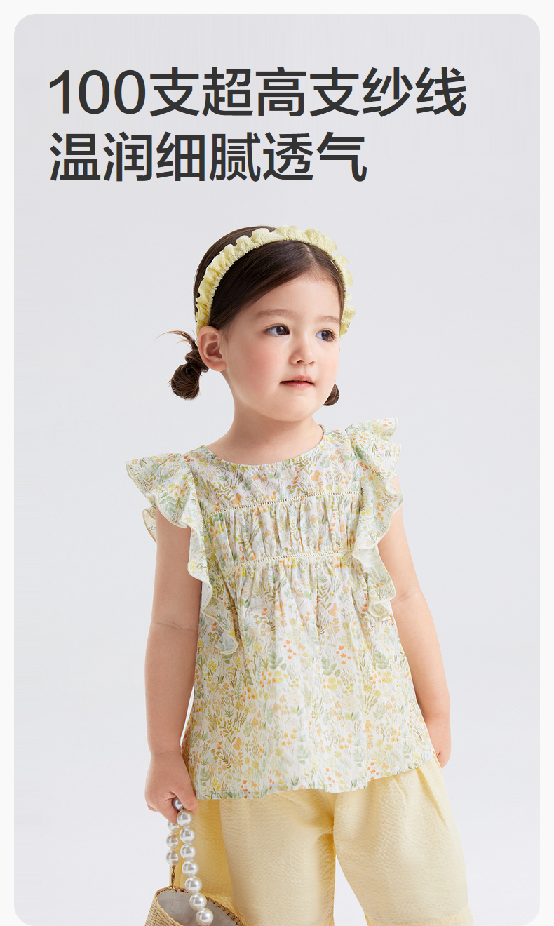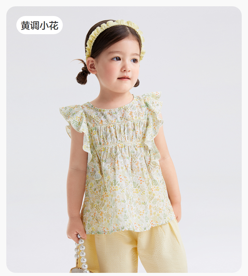 全棉時代女童襯衫短袖夏裝新款100S花邊袖兒童碎花襯衣套頭衫