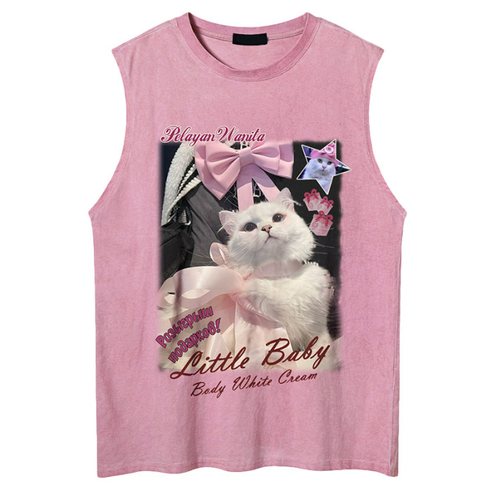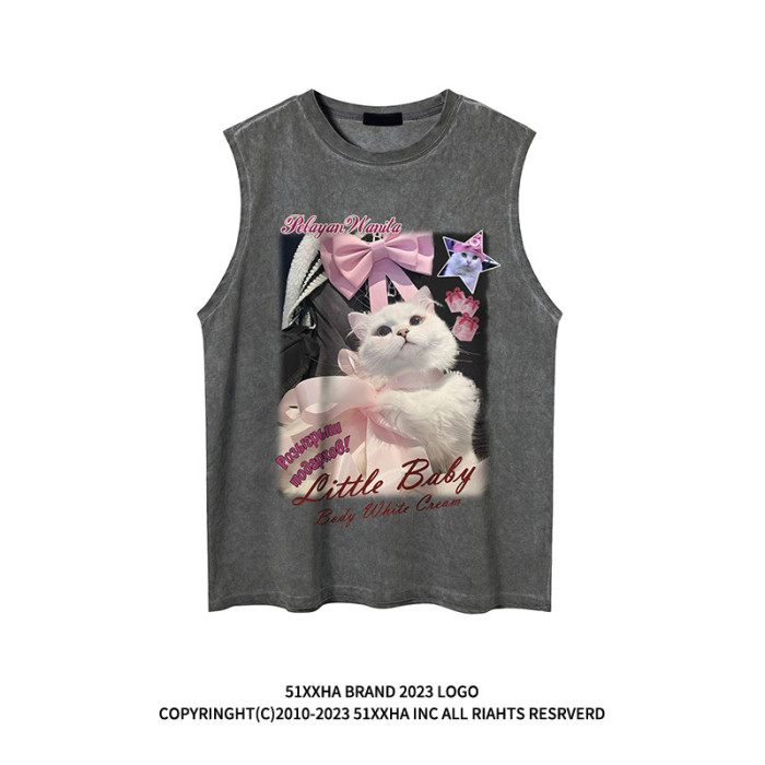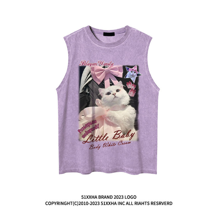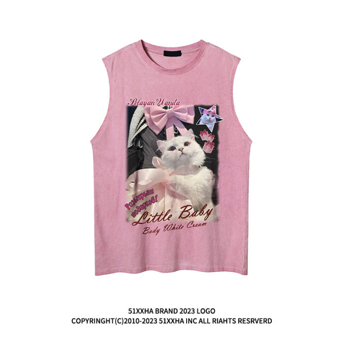 51嘻哈ins潮牌多巴胺貓咪印花寬松無袖T恤男女夏季hiphop坎肩背心