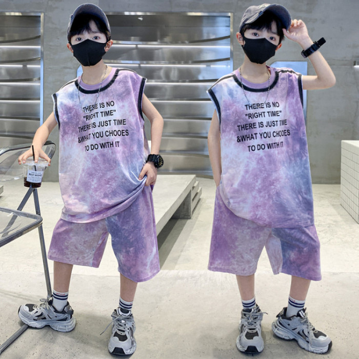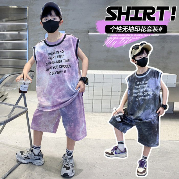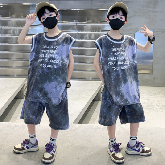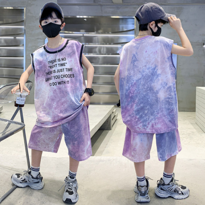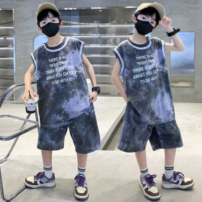 男童無袖套裝純棉寬松紥染洋氣短褲背心兩件套2025新款中大童夏裝