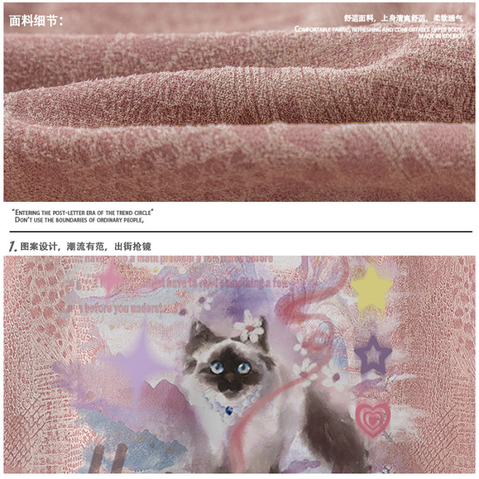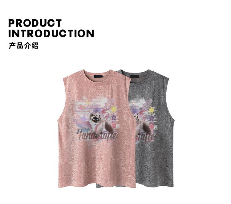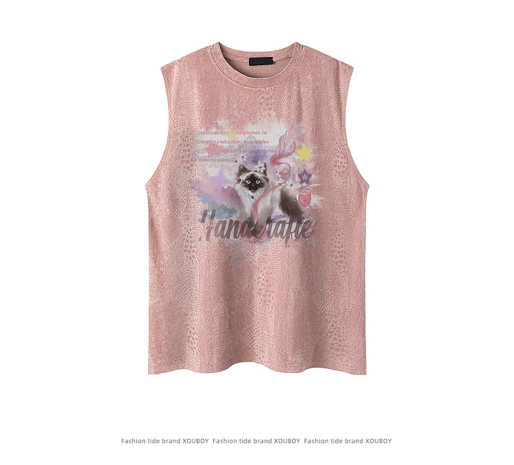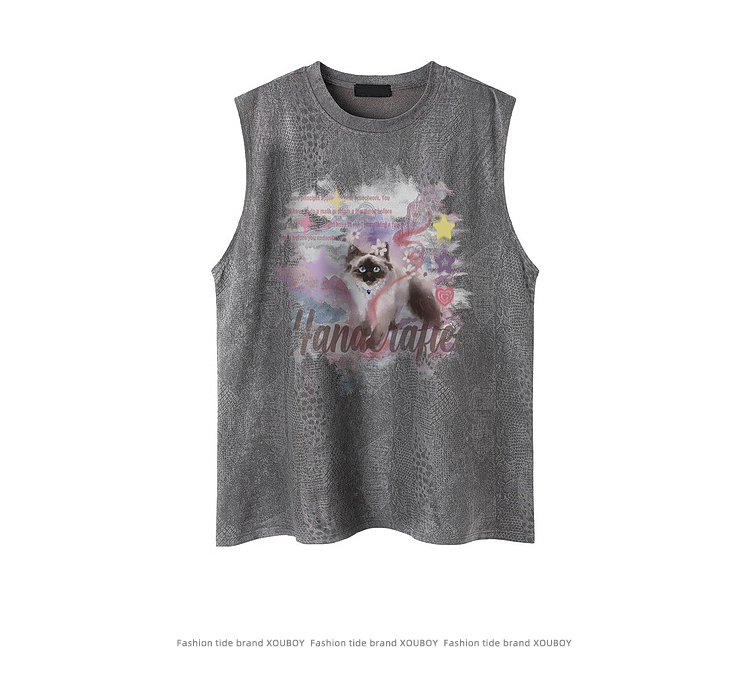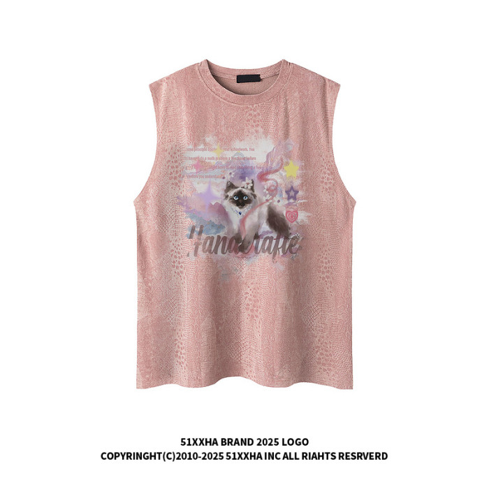 51嘻哈復古vintage小貓印花坎肩背心男女夏季寬松休閒情侶無袖T恤