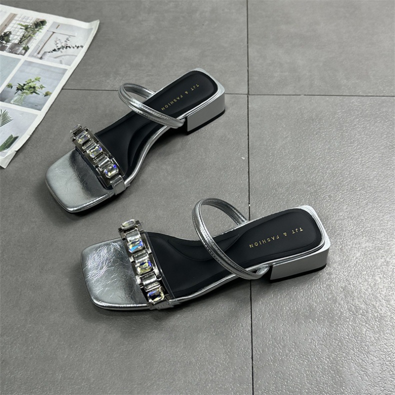 女鞋2024夏季新款百搭方頭露趾水鑽中跟網紅涼拖鞋半拖一字拖
