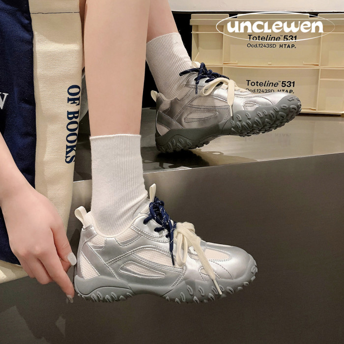 真皮網布德訓鞋女2024秋季新款厚底百搭原創運動鞋休閒戶外阿甘鞋