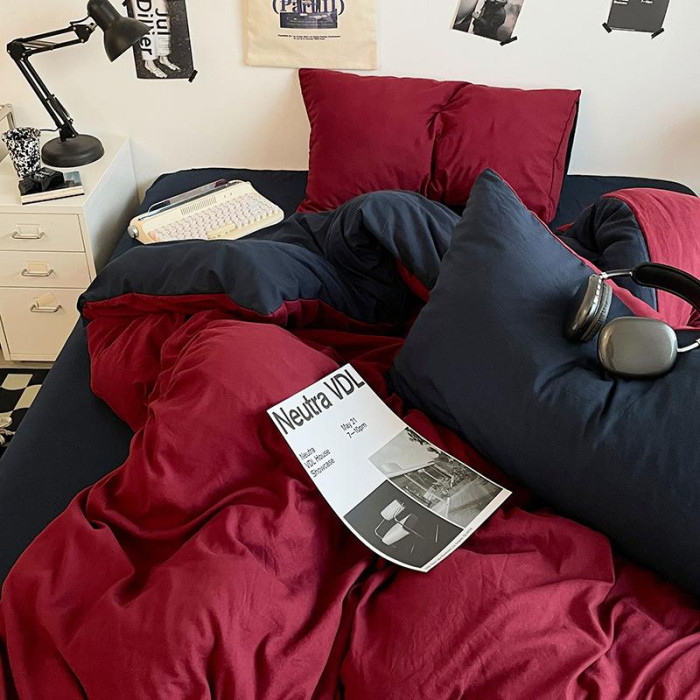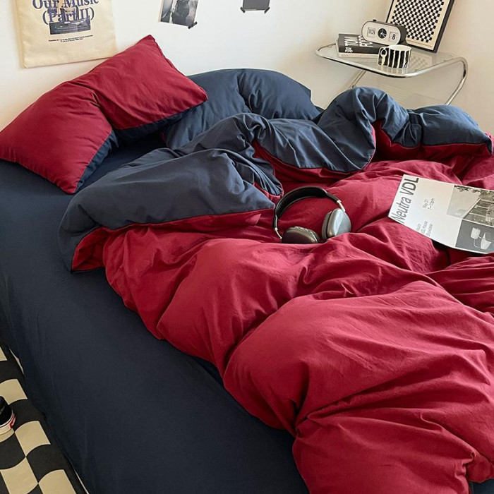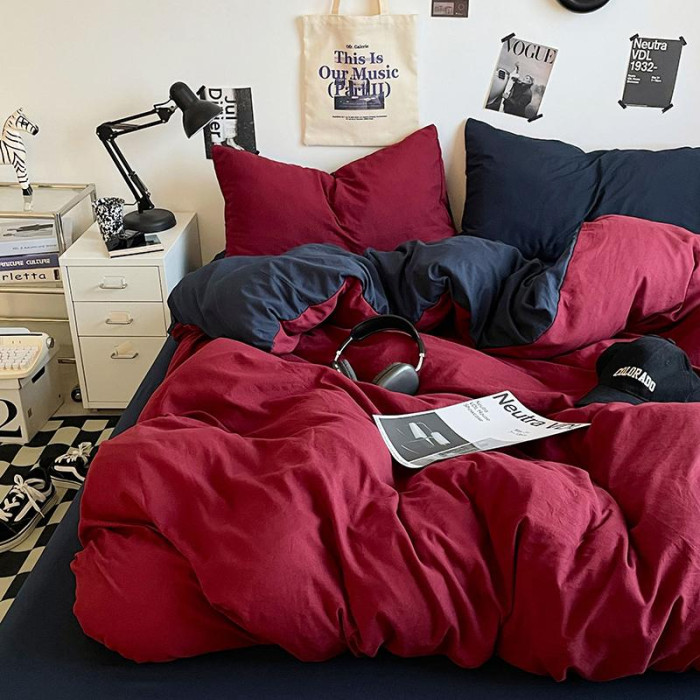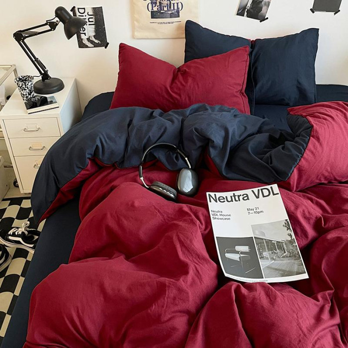ins潮酷安哥拉紅藍雙拼水洗棉床單四件套宿舍柔軟被套被單三件套3