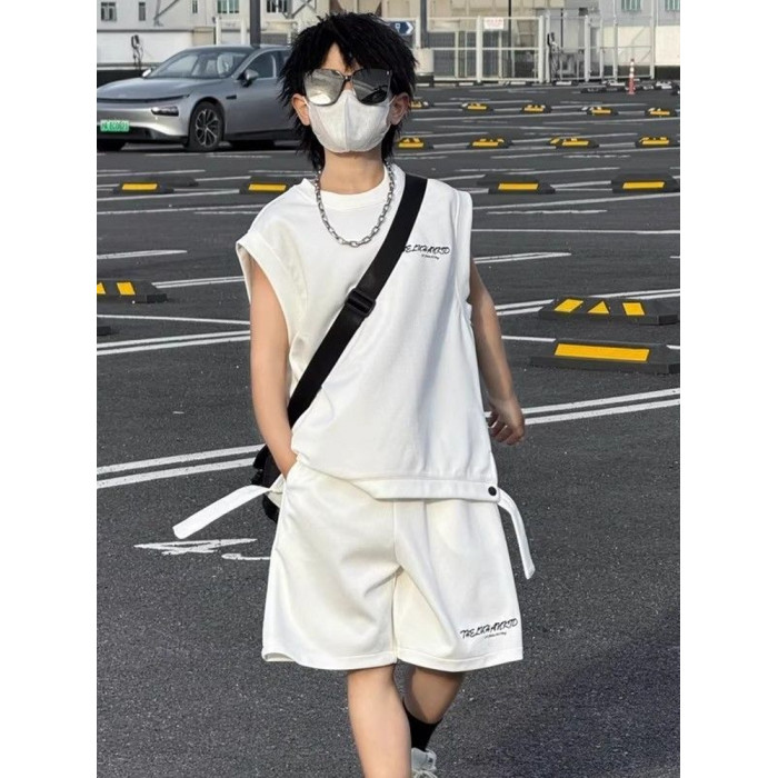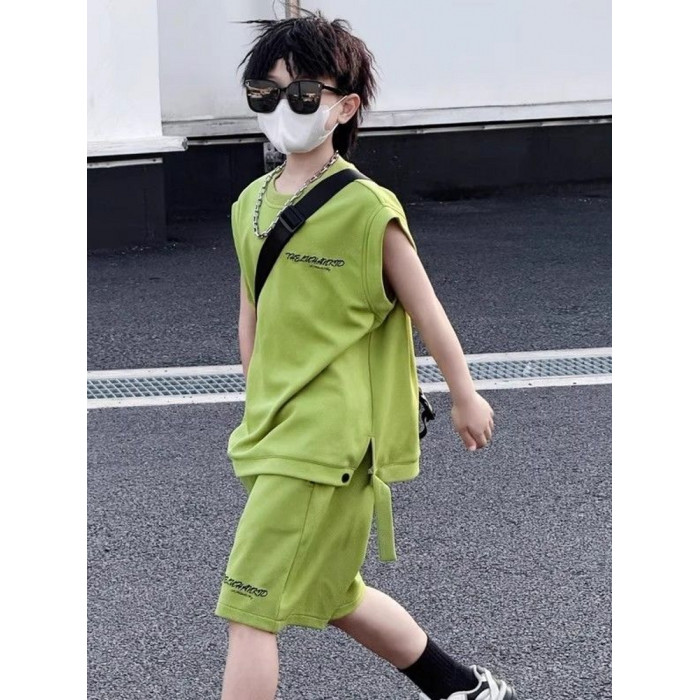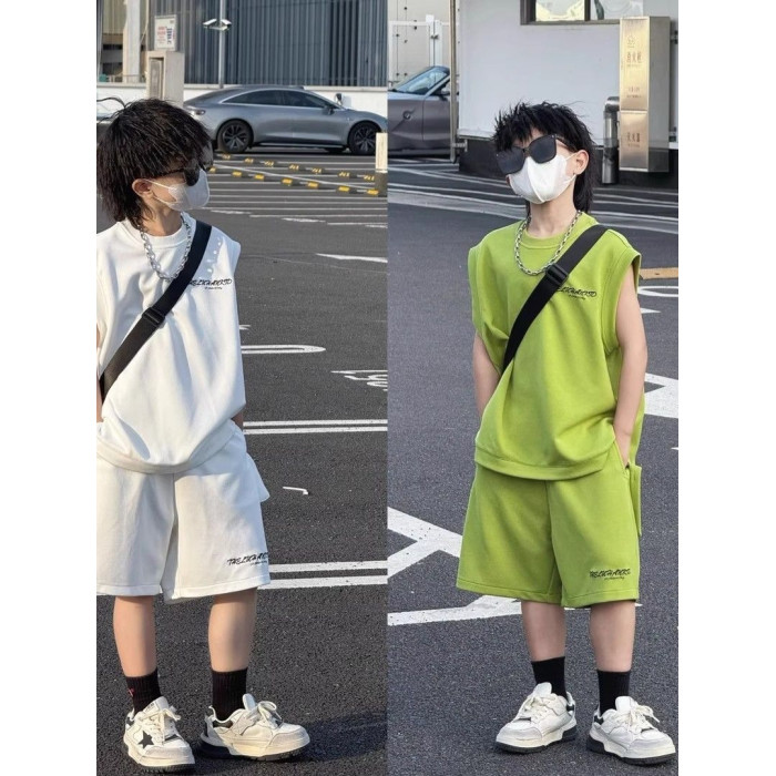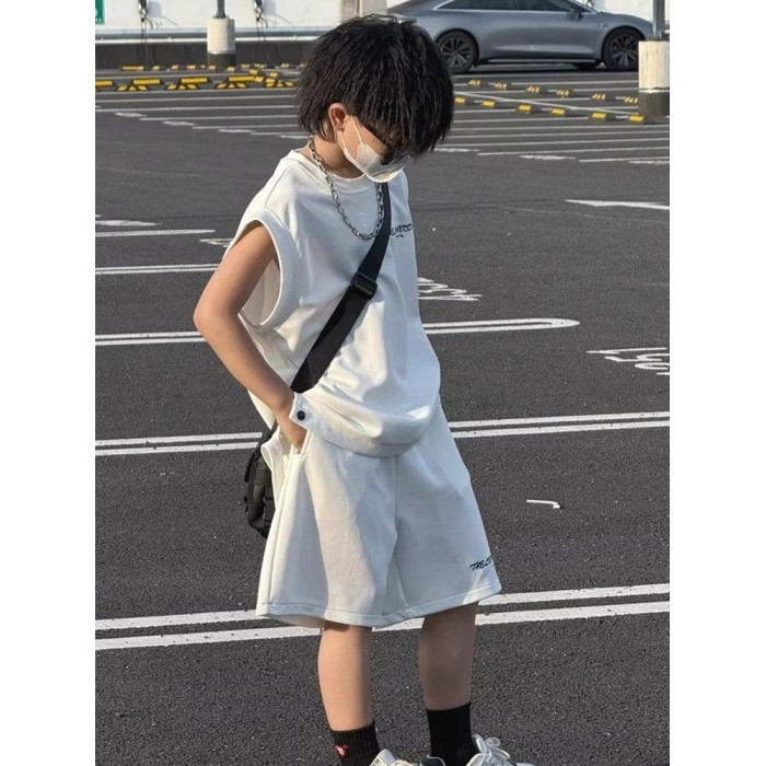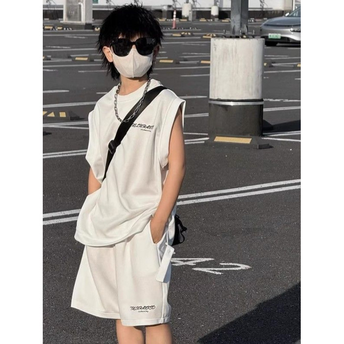 男童夏季無袖坎肩套裝2025新款中大童純色帥氣兒童運動洋氣兩件套