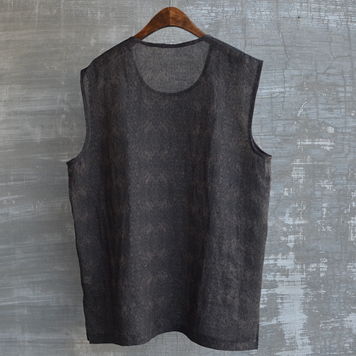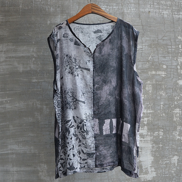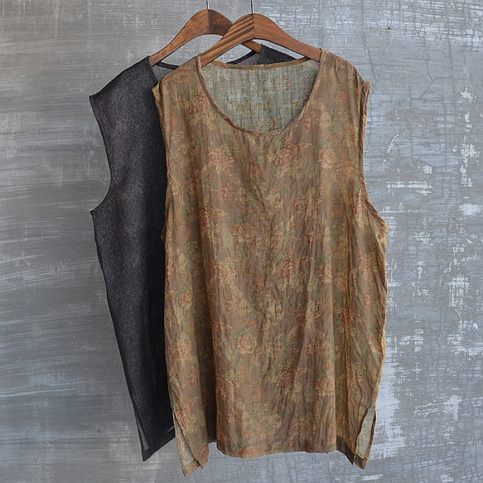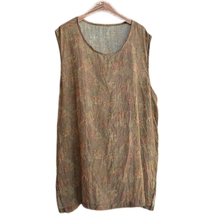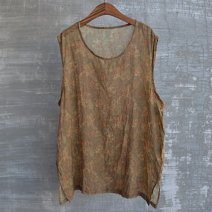 夏季印花苧麻汗背心休閒圓領套頭流行無袖衫舒適涼爽透氣休閒青春
