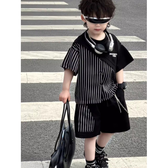 香港BAKUXIA男童夏季短袖條紋套裝韓版2025拼接痞帥氣兒童兩件套