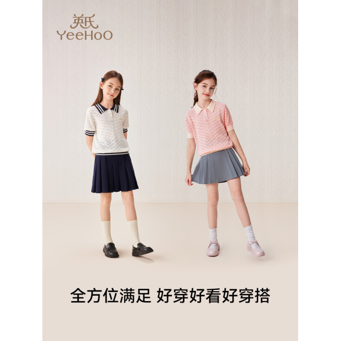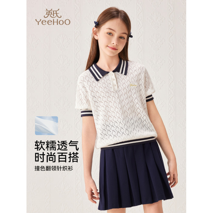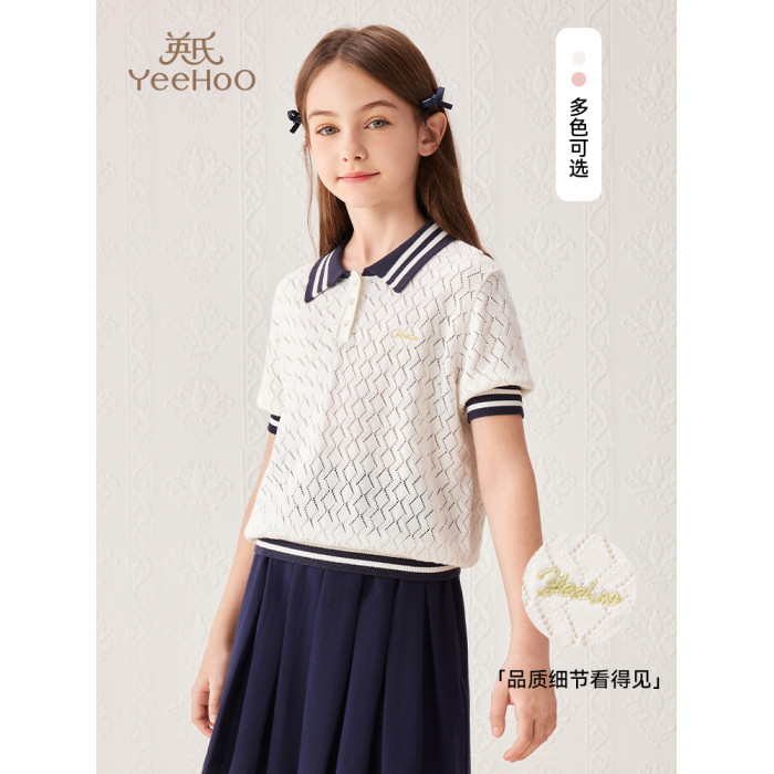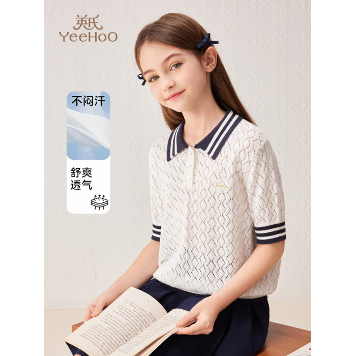 英氏女童短袖t恤翻領2025夏季新款兒童鏤空透氣小香風針織衫上衣