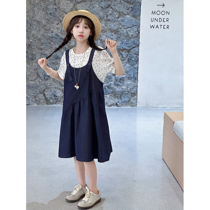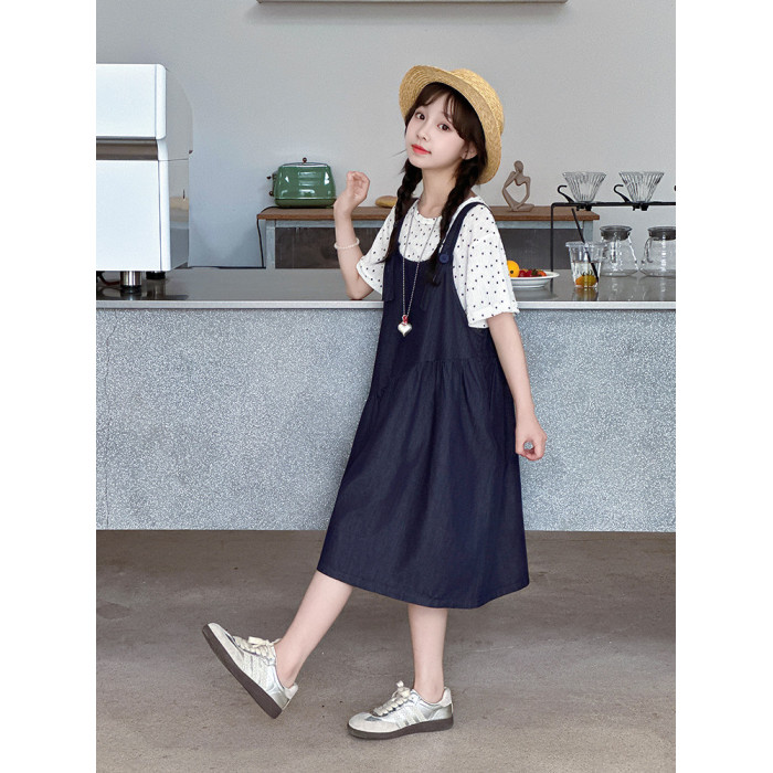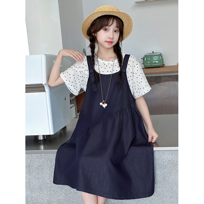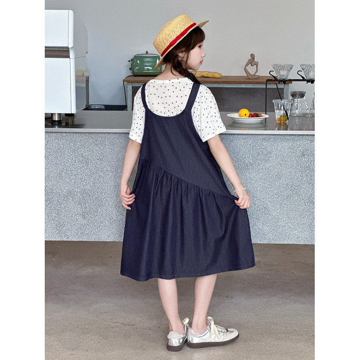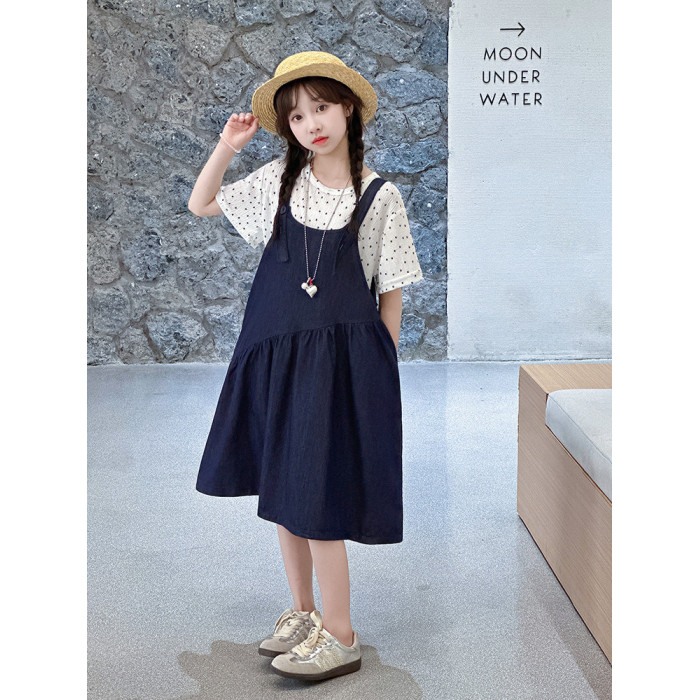 女童夏季牛仔背帶裙套裝2025新款女大童時尚波點短袖吊帶裙兩件套