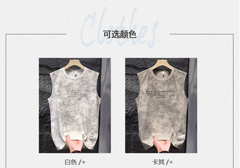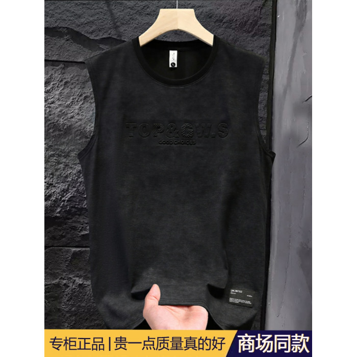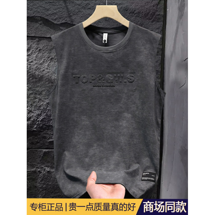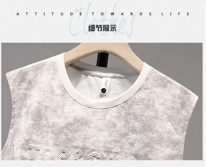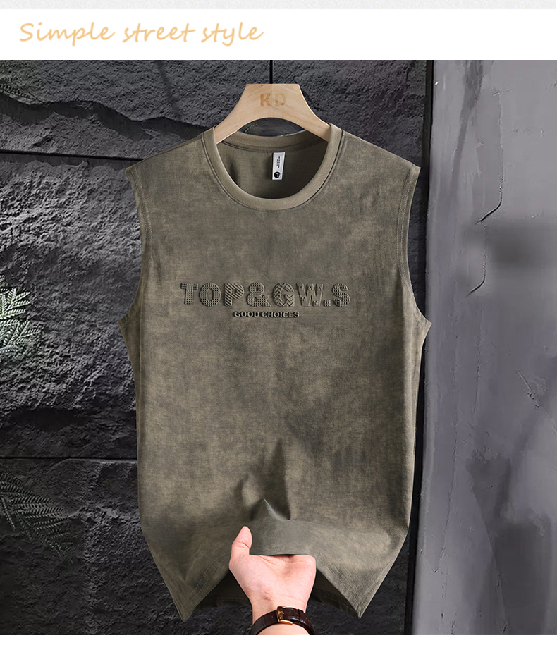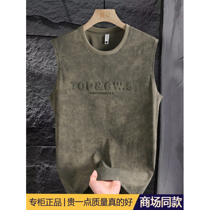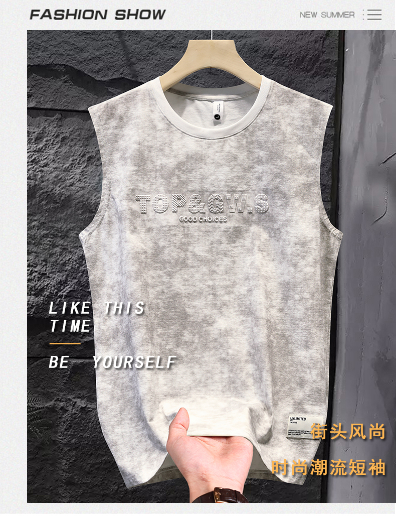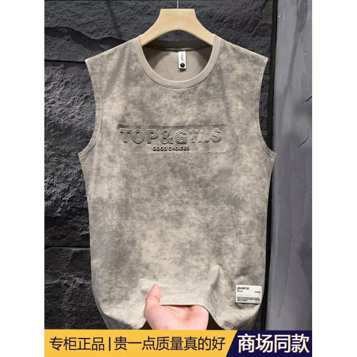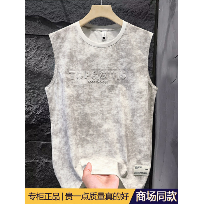 高級男士夏季無袖t恤紥染運動汗背心鋼印青年上衣個性健身打底衫
