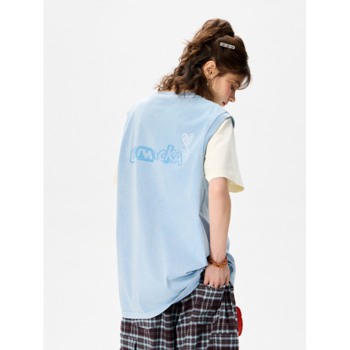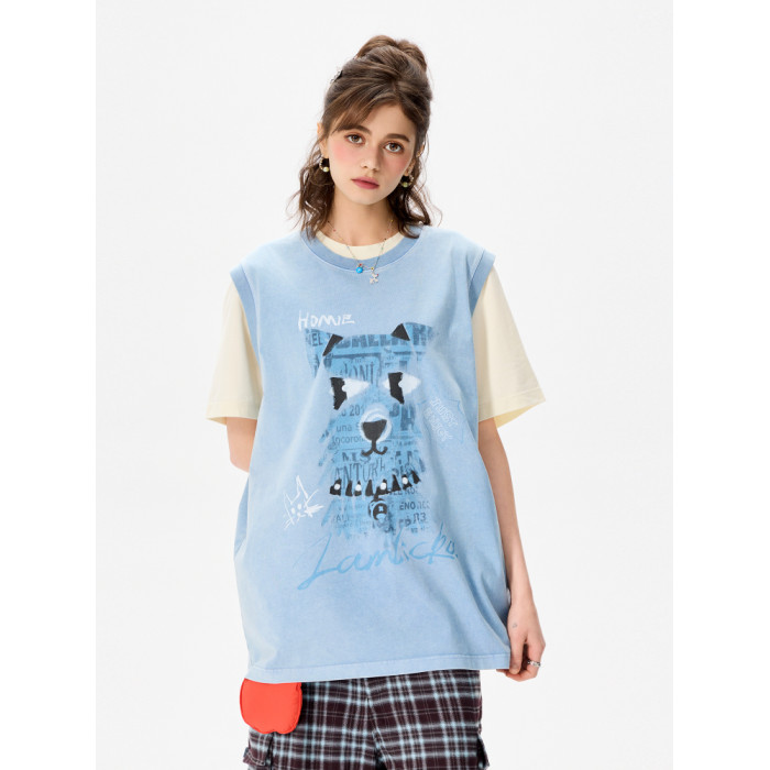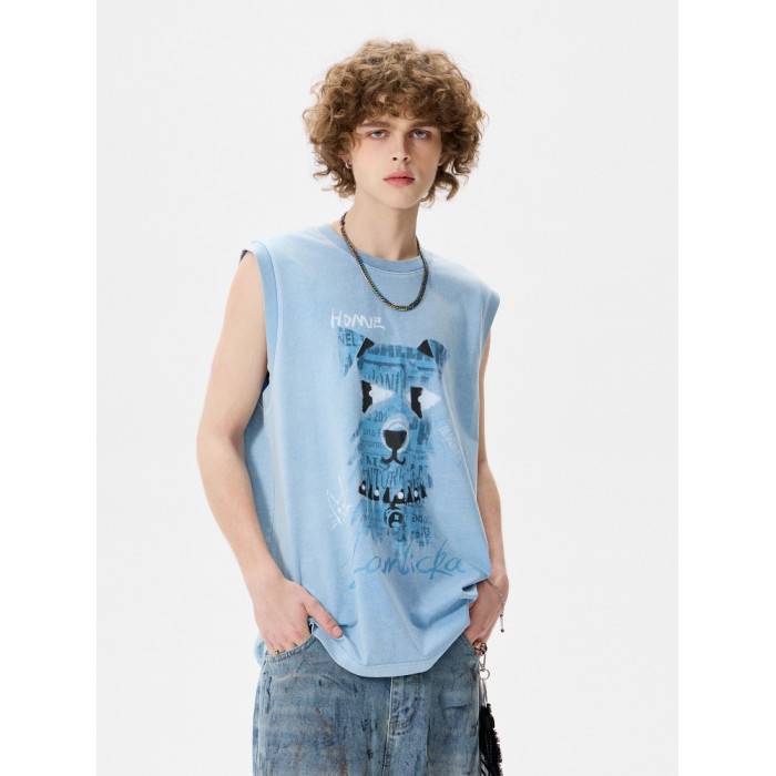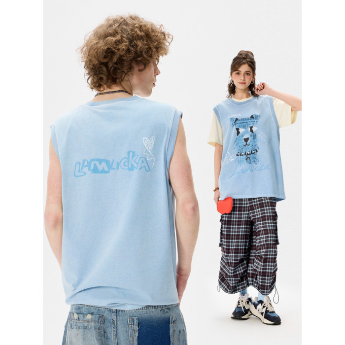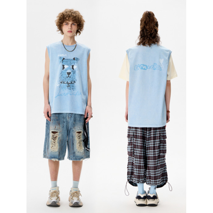 LAMLICKA藍色小狗背心男夏季潮牌美式復古坎肩寬松無袖t恤可外穿