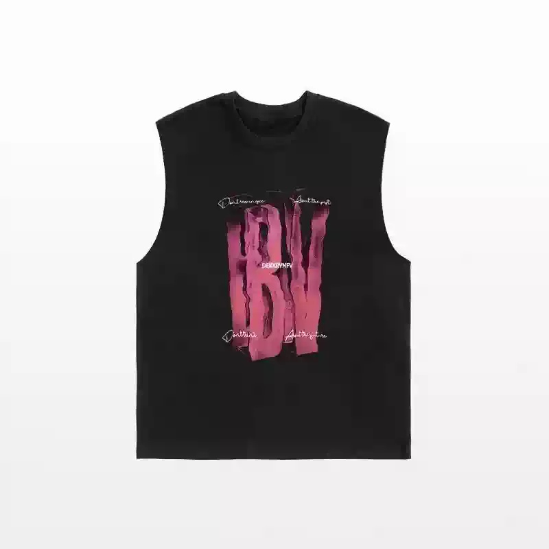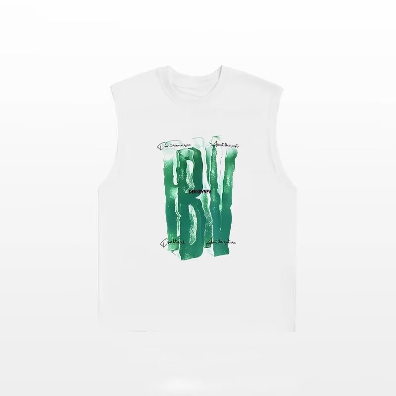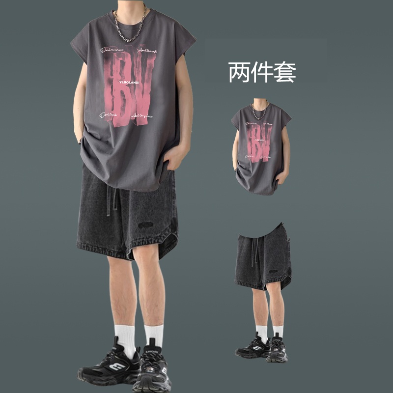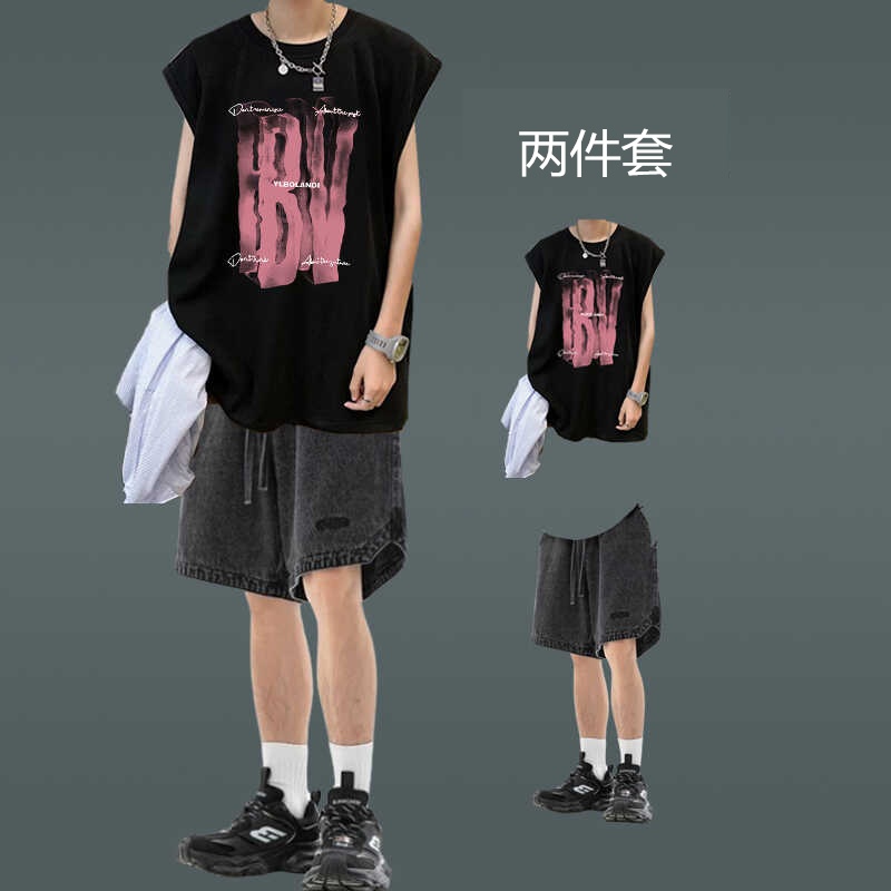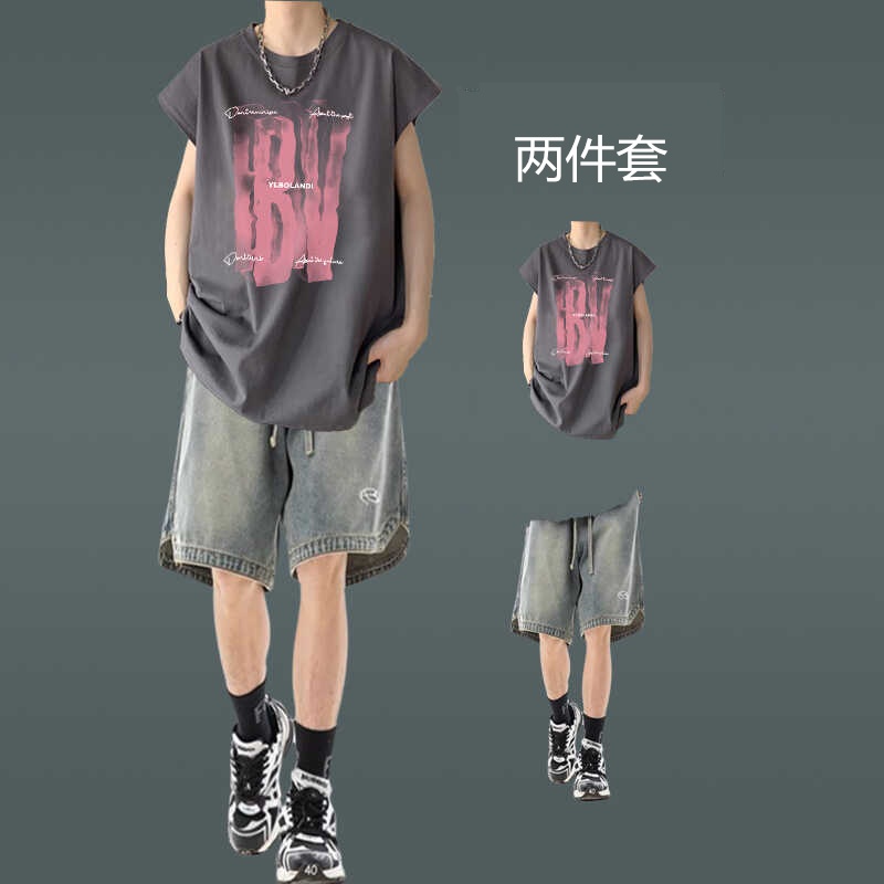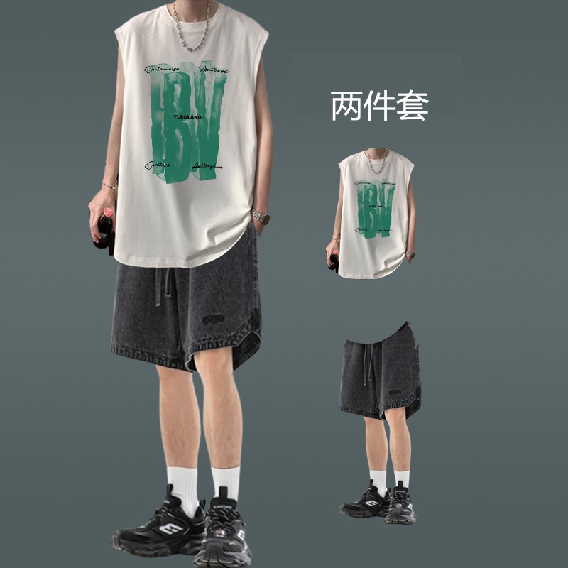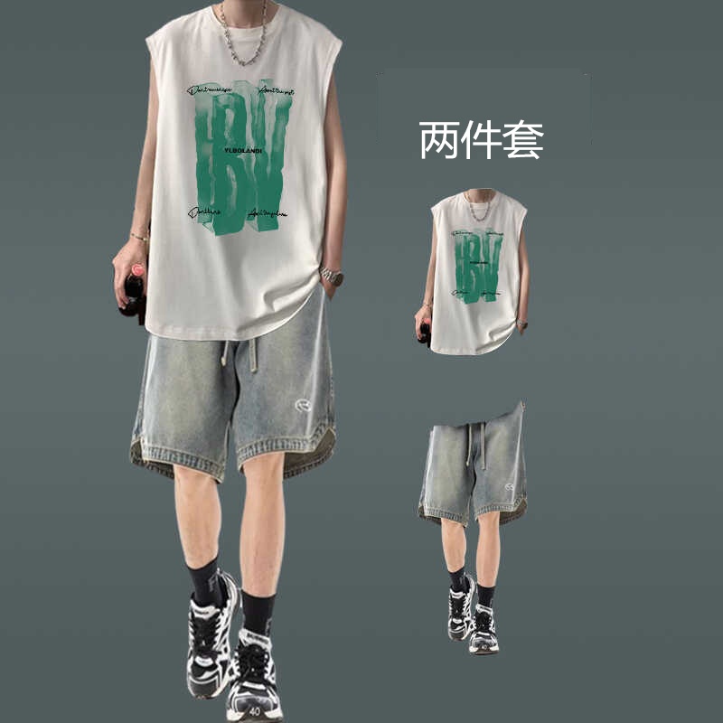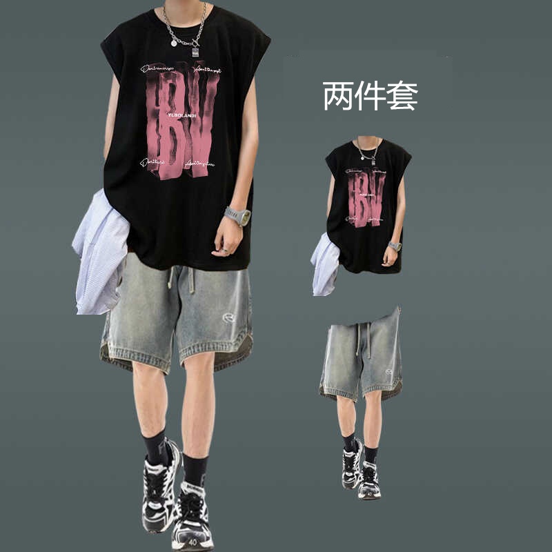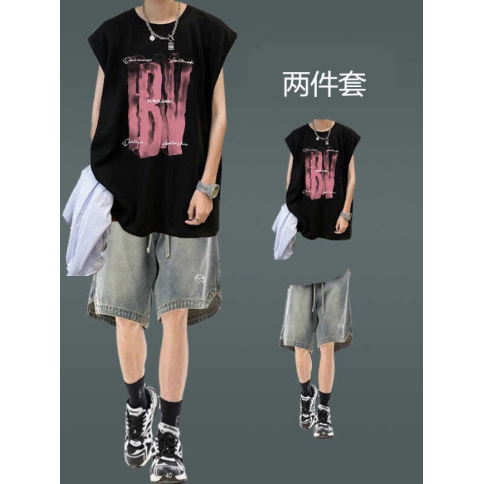 潮牌街頭背心男裝薄款無袖坎肩T恤穿搭牛仔短褲一套夏季休閒套裝