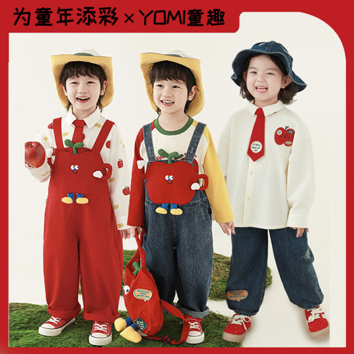 男童春季新款長袖圓領T恤翻領襯衫背帶褲蘋果達人套裝