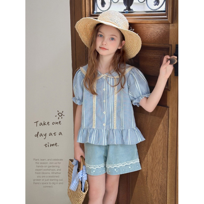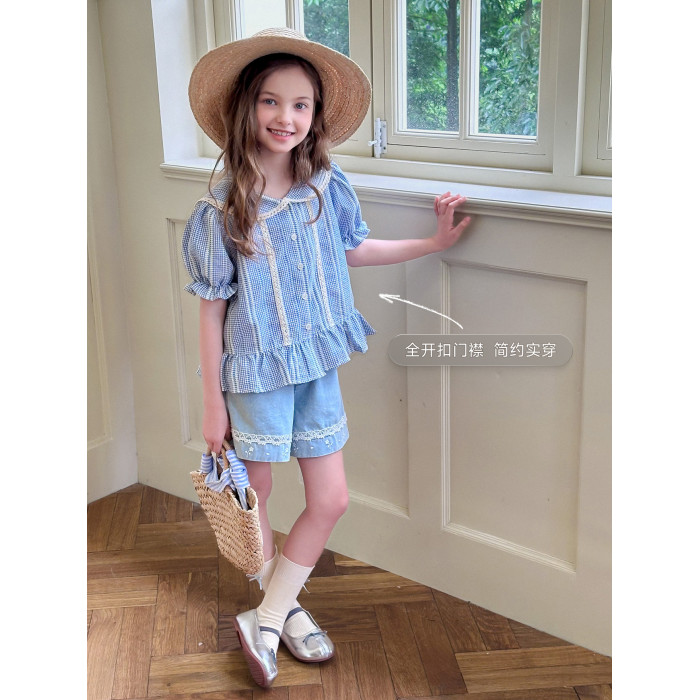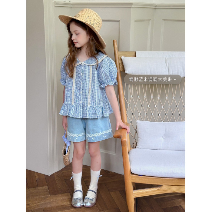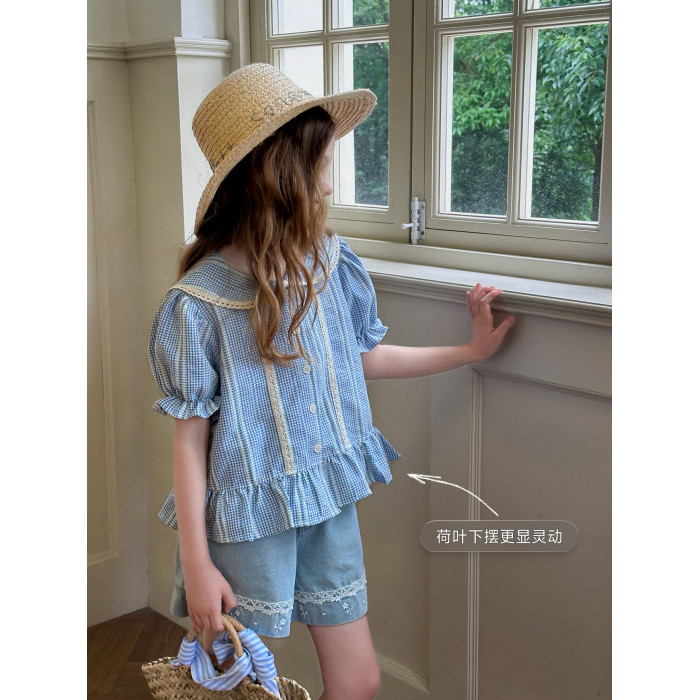 【冰島格】藍小爸童裝女童格紋短袖襯衫夏新款泡泡袖花邊顯瘦上衣