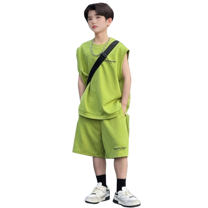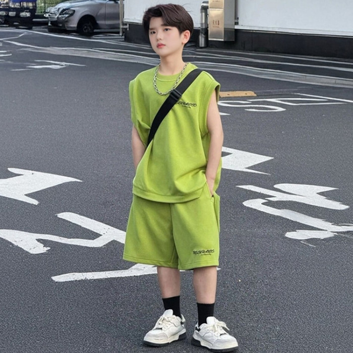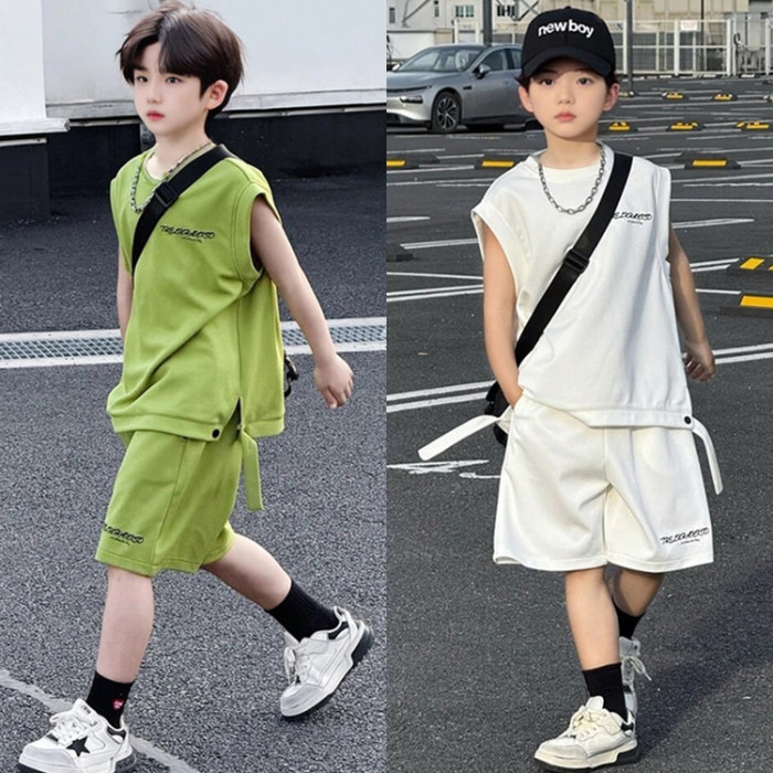 男童套裝夏裝2025新款男中大童夏裝韓版T恤短褲無袖潮帥氣兩件套