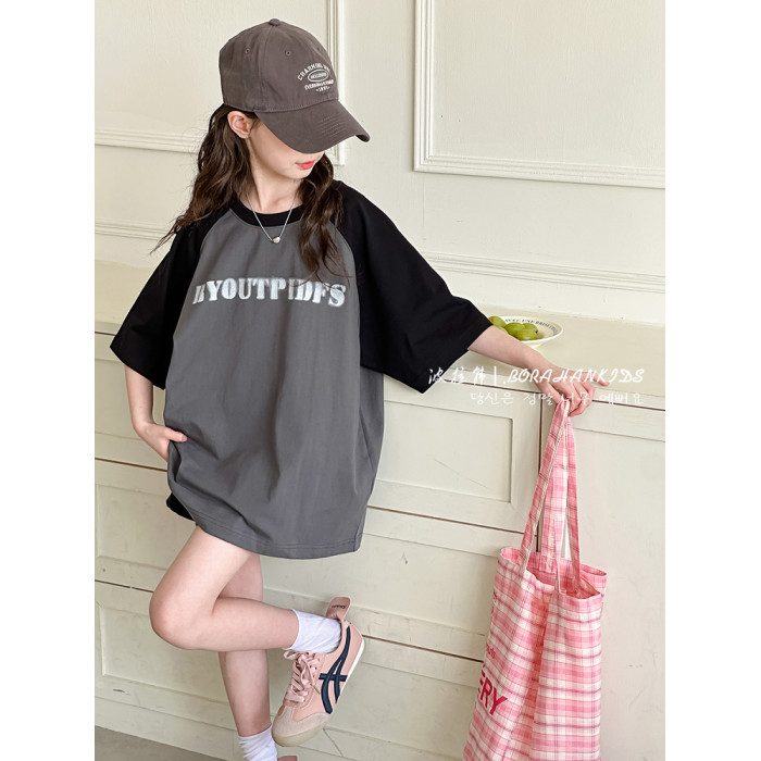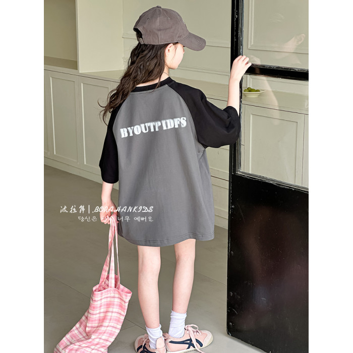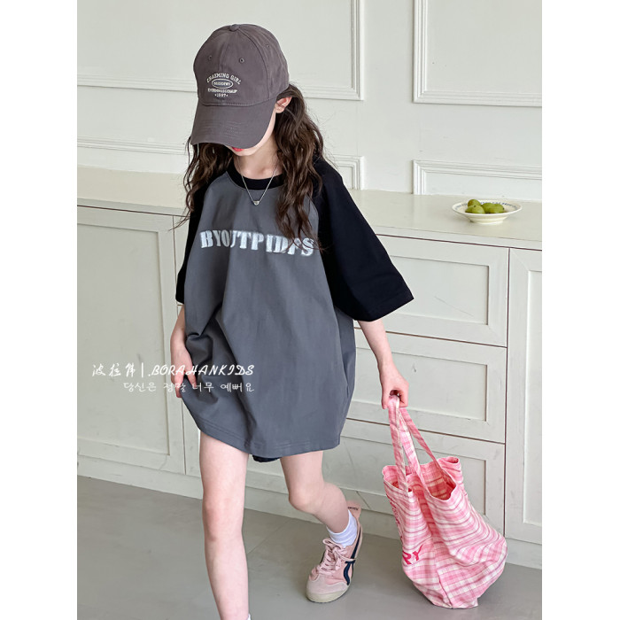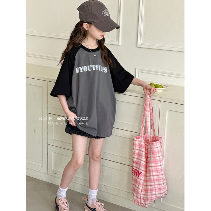 波拉韓女童插肩袖T恤2025新款兒童短袖夏裝上衣女孩時髦半袖t衣服
