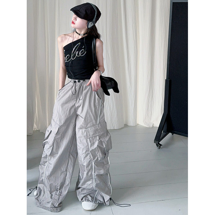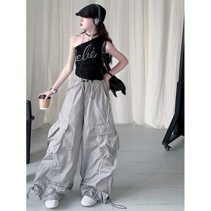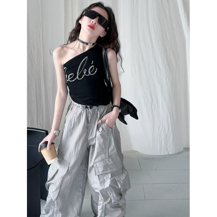 女童燙鑽斜肩背心黑色緊身兒童爵士街舞小吊帶外穿掛脖上衣演出服
