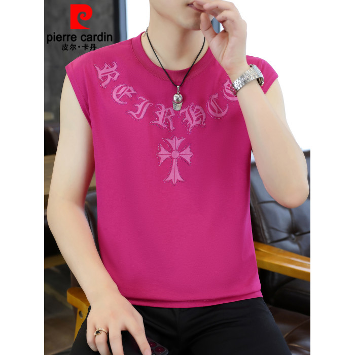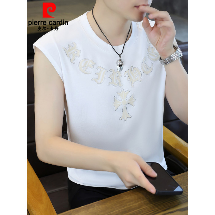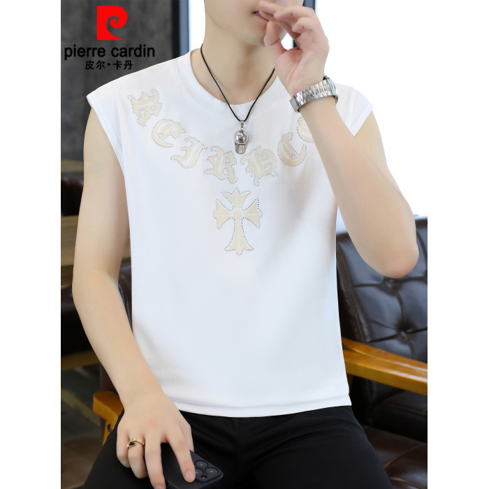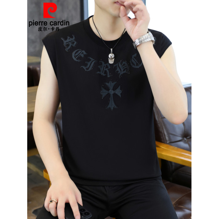 皮爾卡丹高級冰絲棉燙鑽無袖T恤潮流休閒透氣背心男款百搭坎肩薄