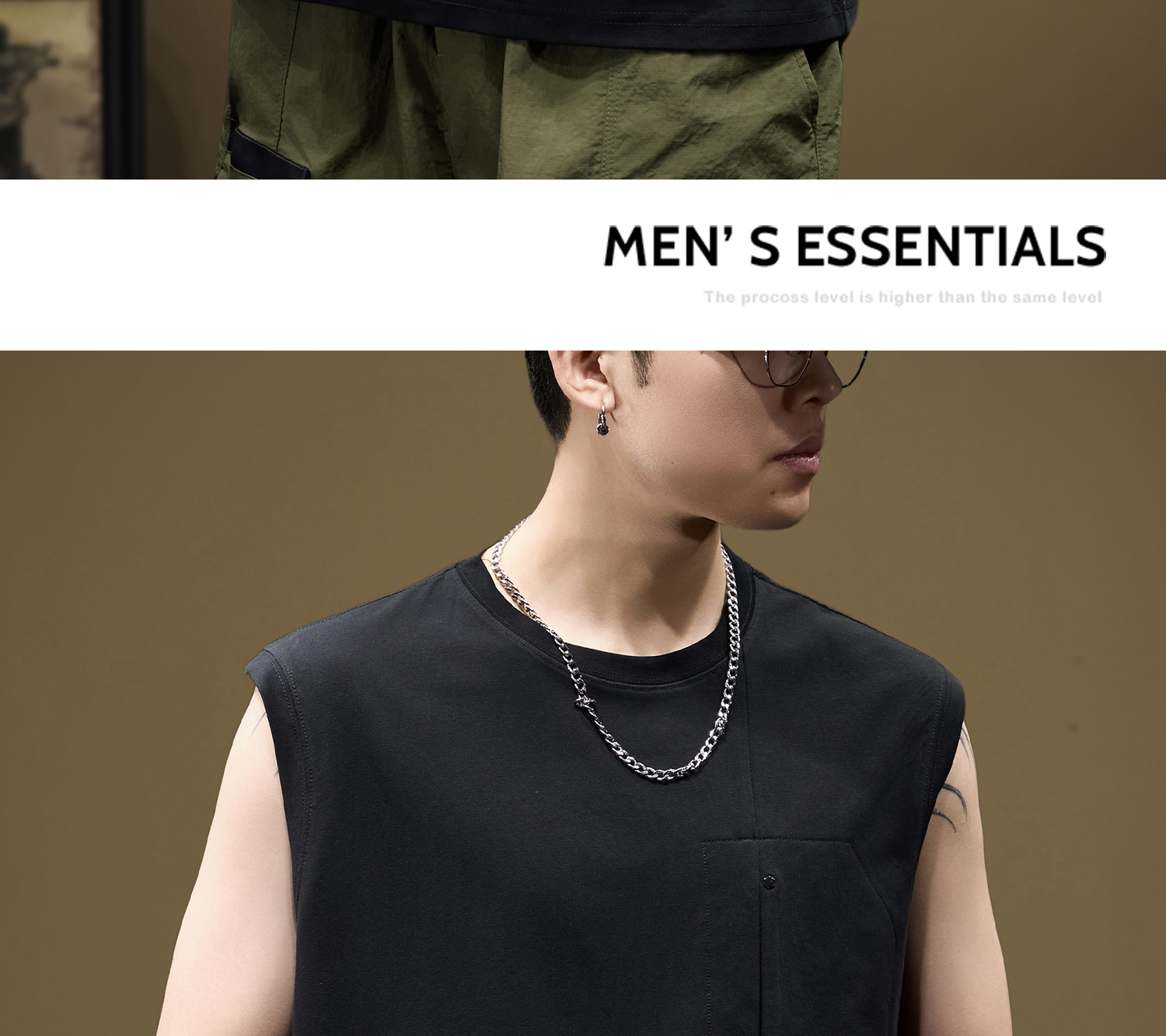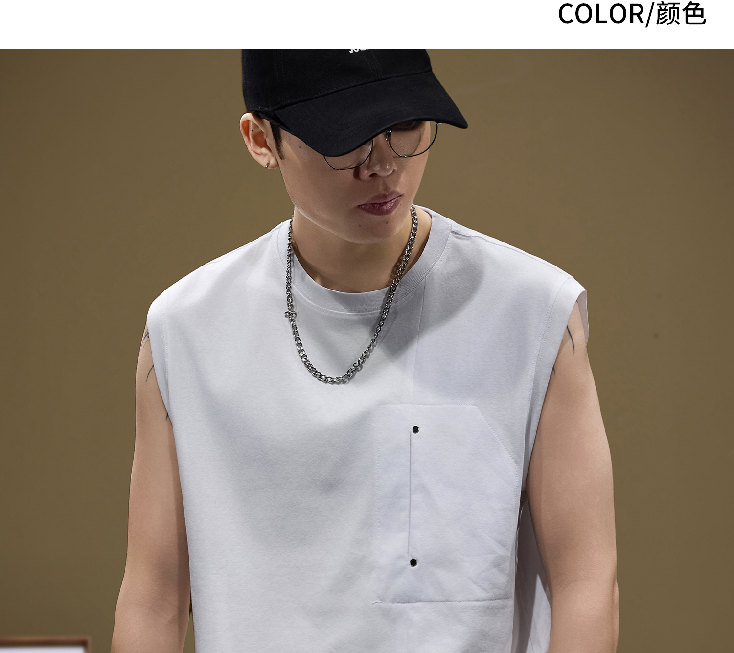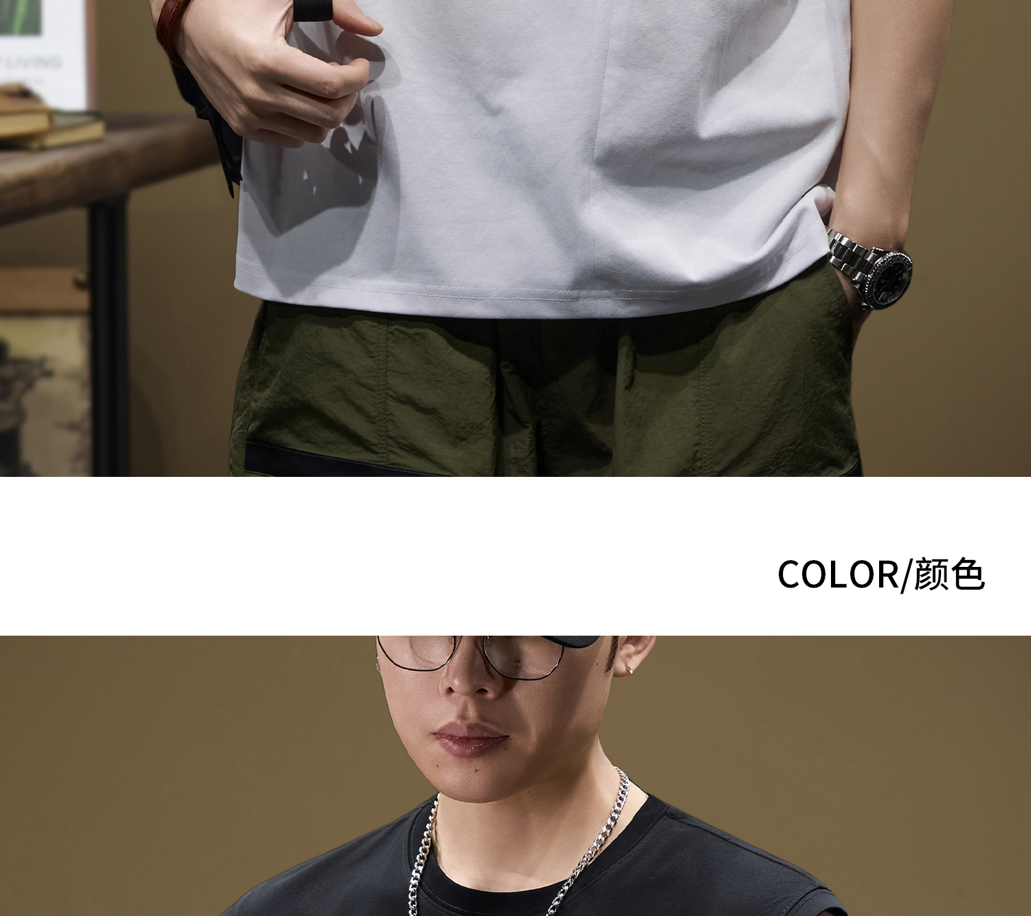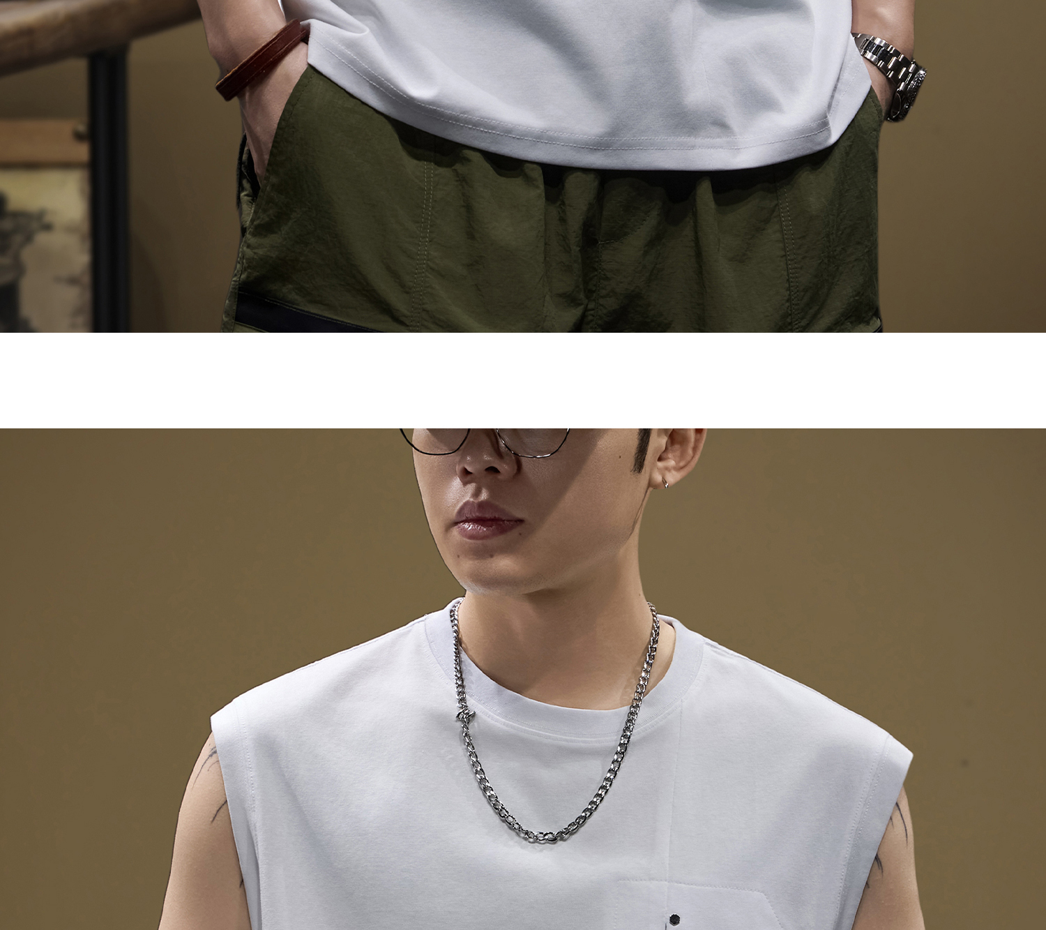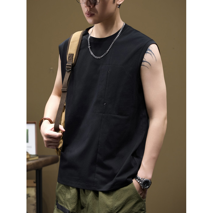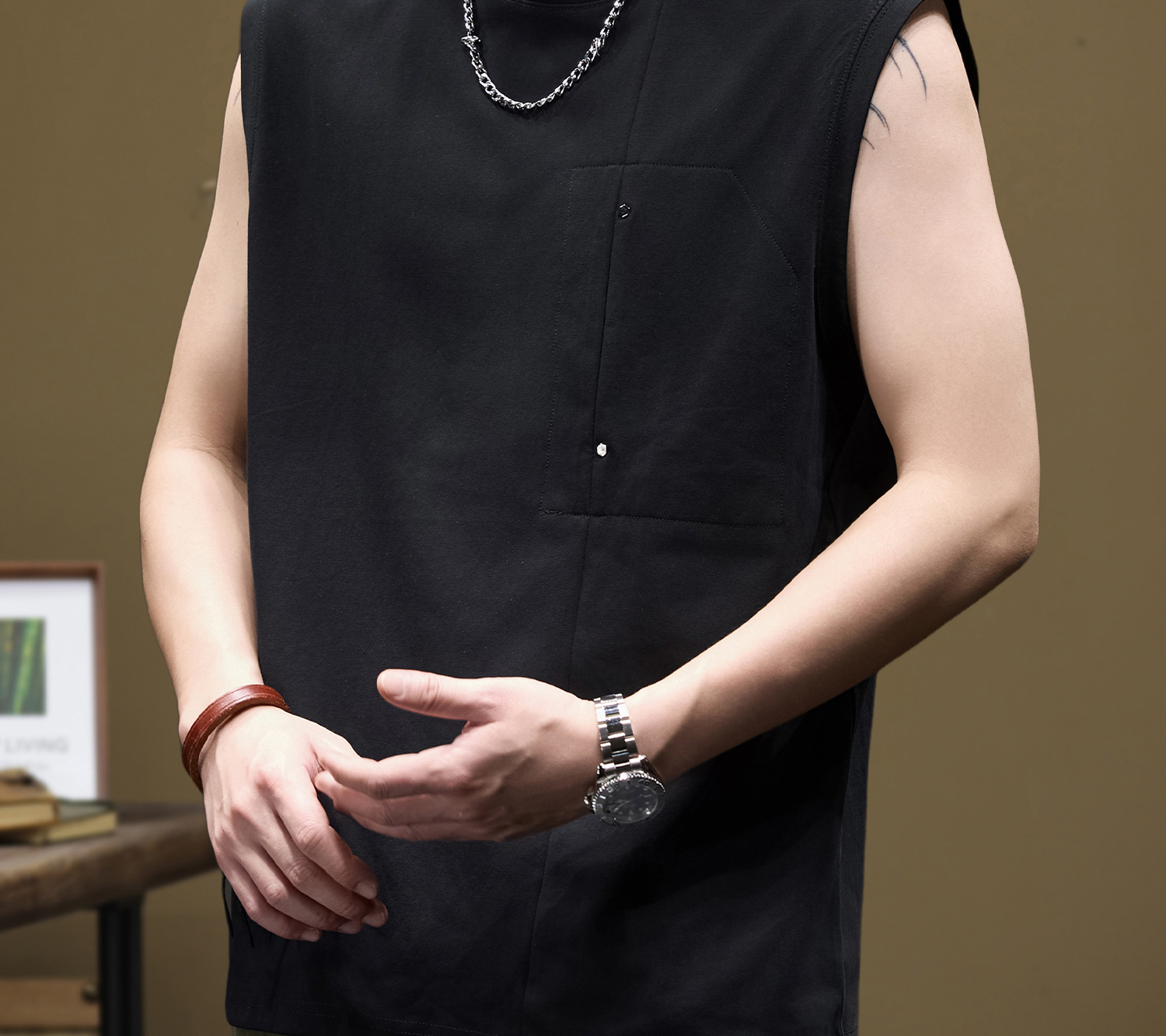 美式拼接純色背心T恤男士夏季高級圓領休閒外穿籃球健身運動背心