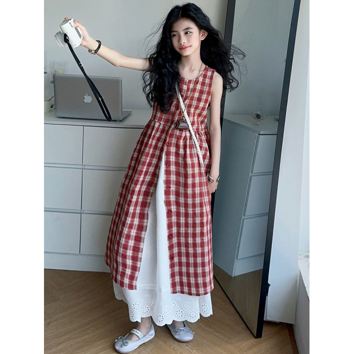 女童夏季連衣裙新款女大童韓系曡穿格子裙兒童夏裝慵懶風裙子洋氣