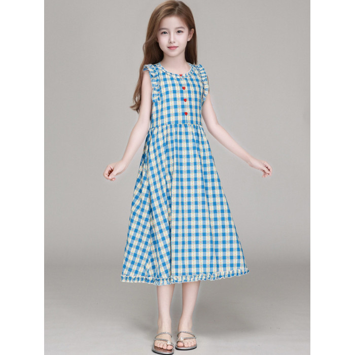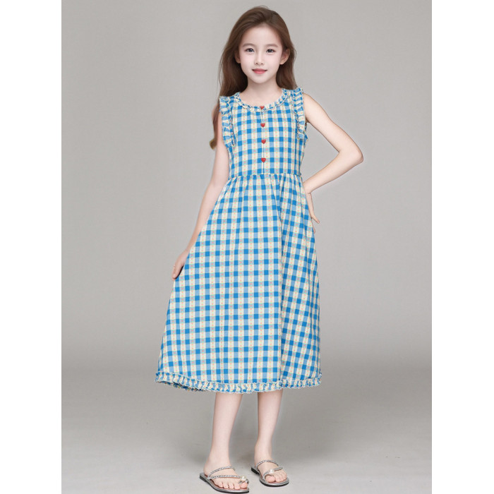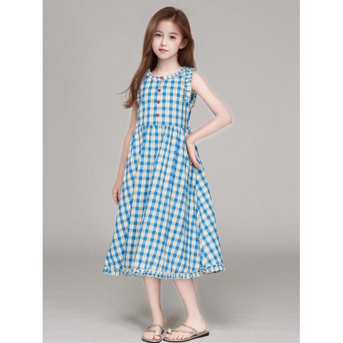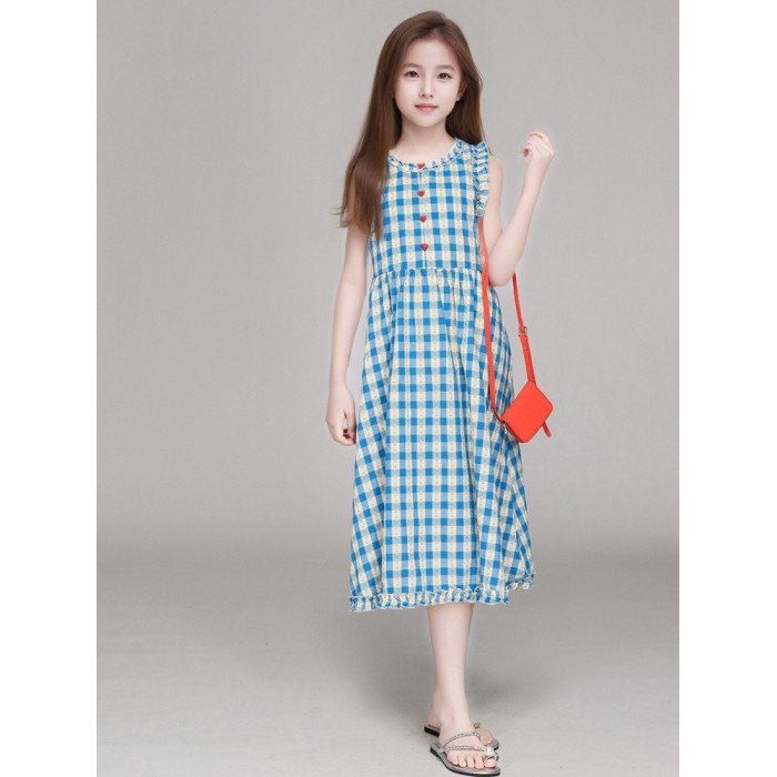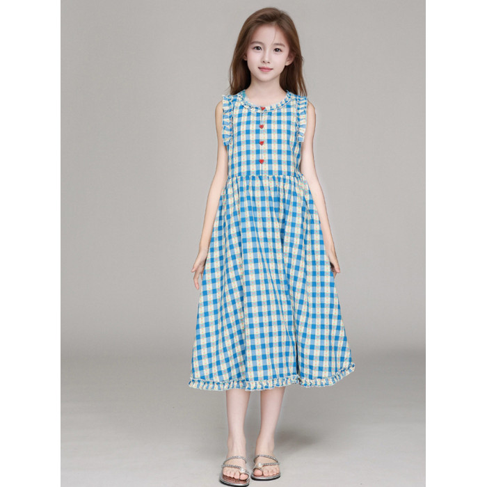 夏季女童花邊純棉藍色格子背心裙 童裝新品度假連衣裙 中大兒童裙
