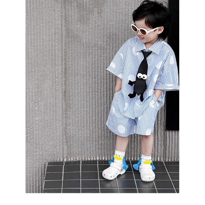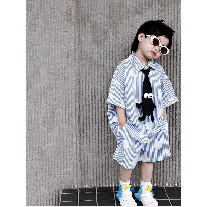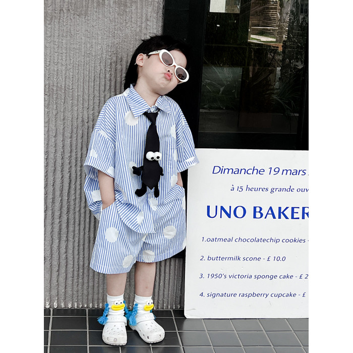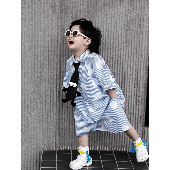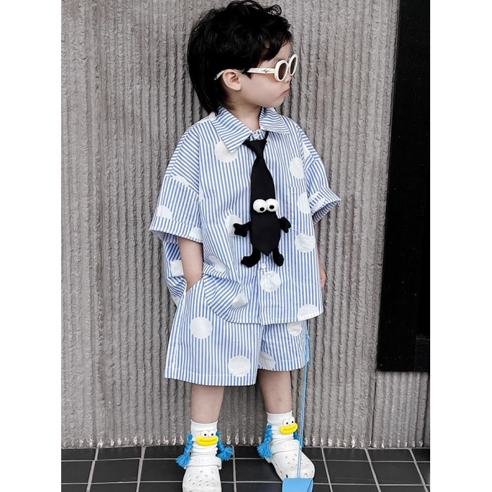 2025夏季中大童洋氣時髦男童套裝新款學院風短袖兒童酷帥襯衫套裝
