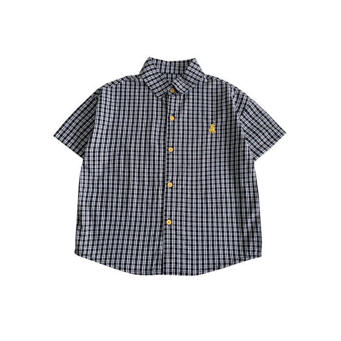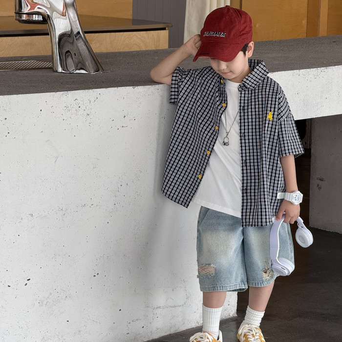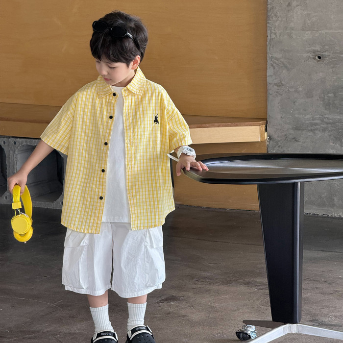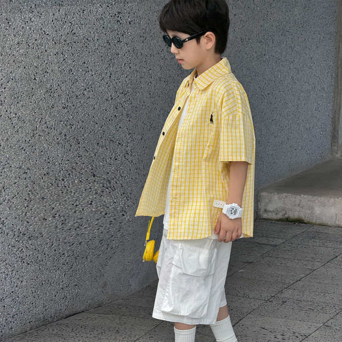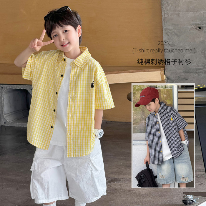 童酷2025男童夏季新款童裝韓版刺綉格子翻領短袖兒童