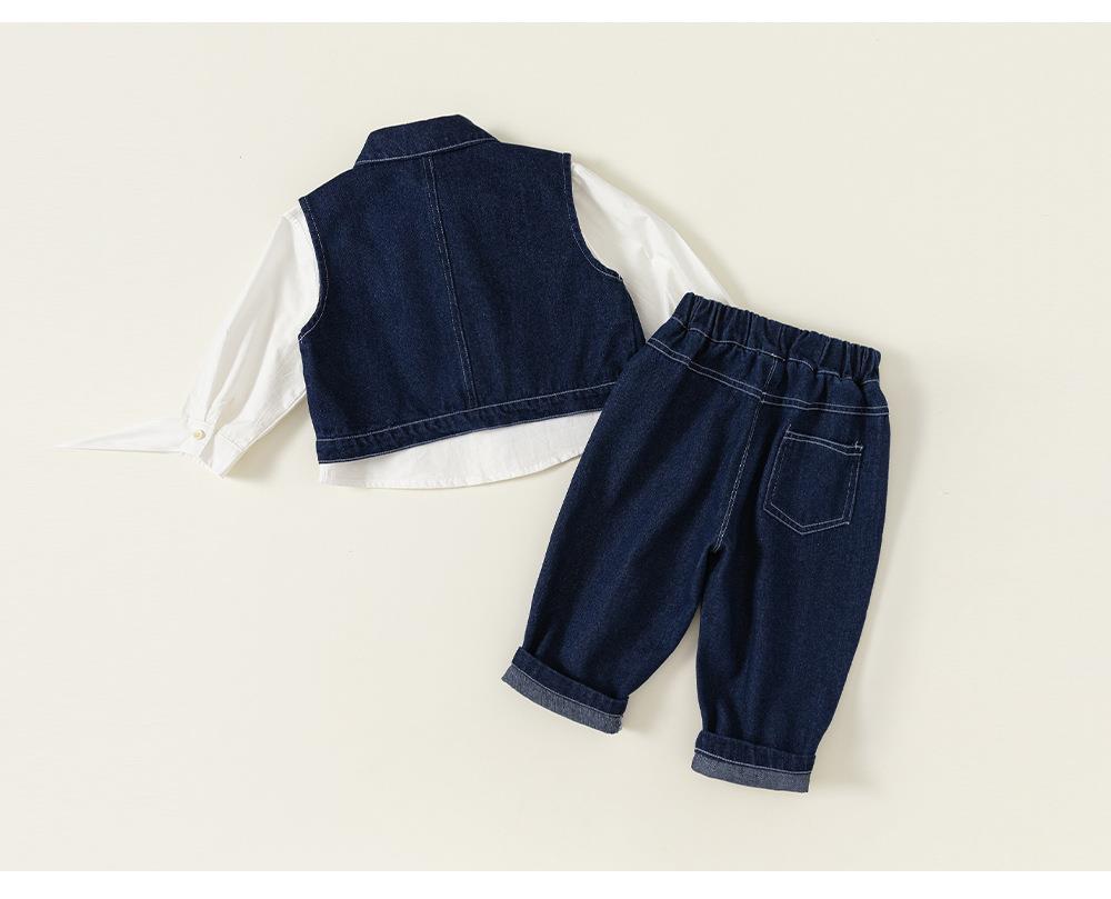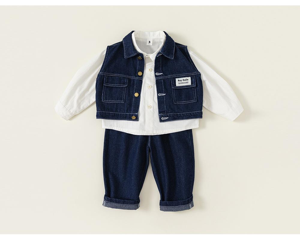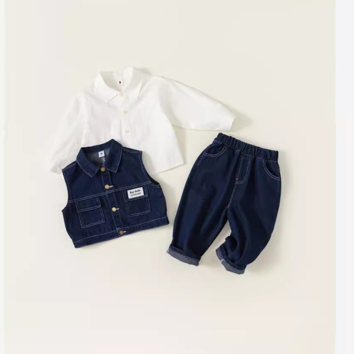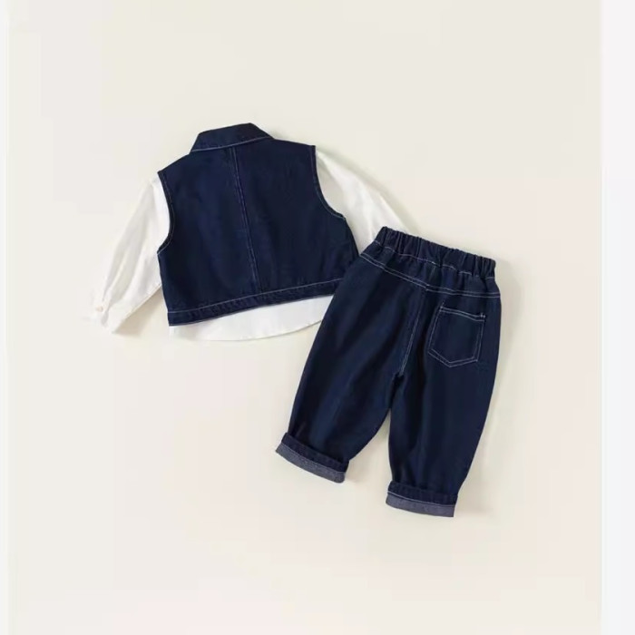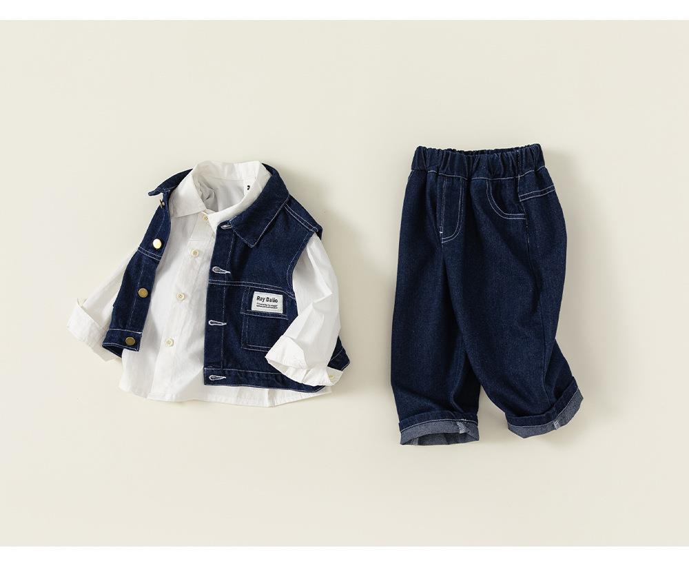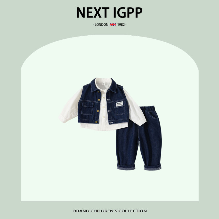 英國NEXT IGPP男童春秋季套裝洋氣牛仔馬甲白色襯衫牛仔褲三件套