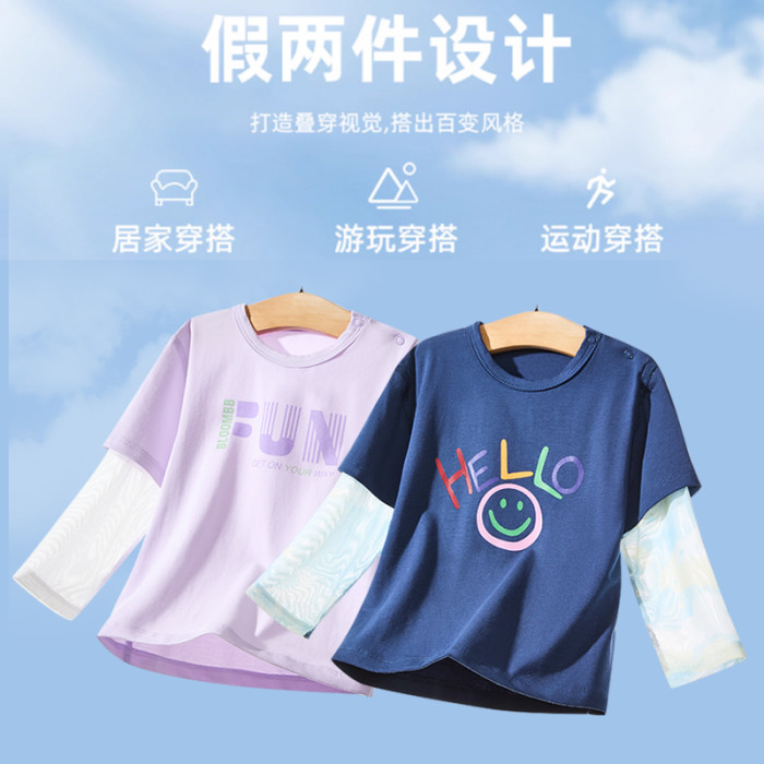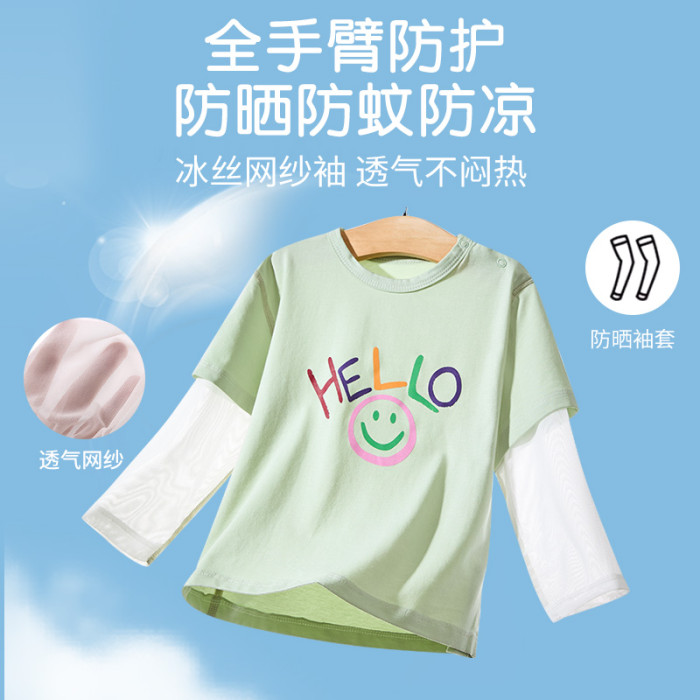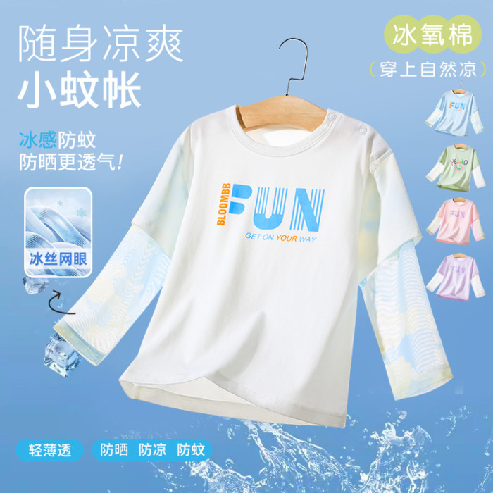 涼感兒童夏季薄長袖T恤純棉寶寶防曬服防蚊上衣假兩件冰袖速乾衣