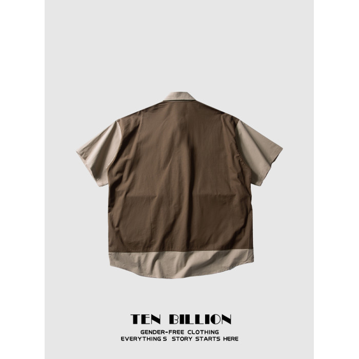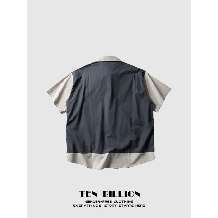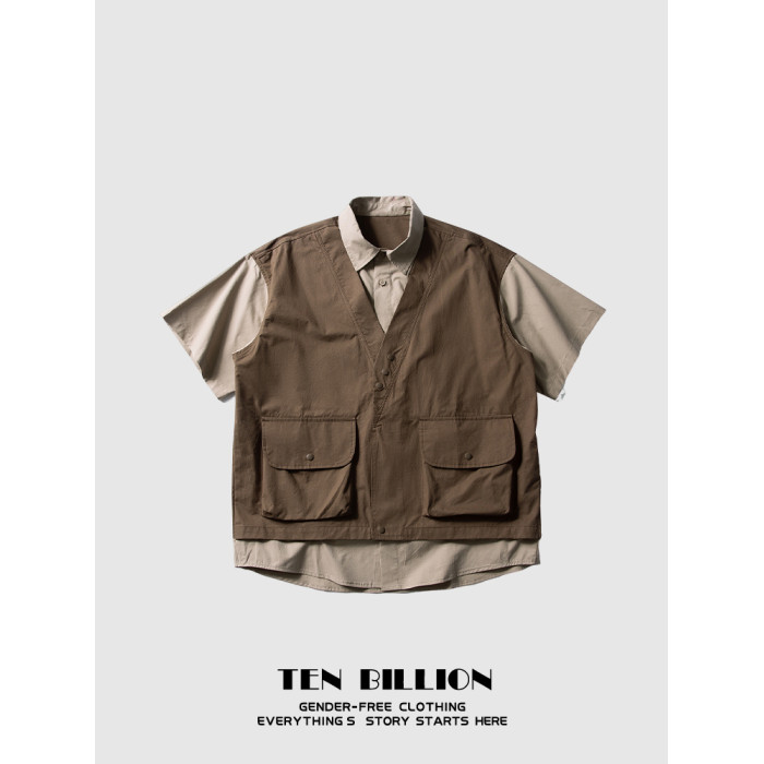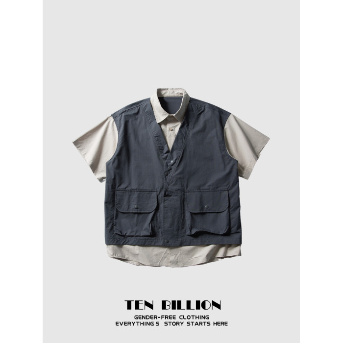 TEN BILLION 設計師品牌 日系復古拼接假兩件馬甲短袖襯衫男夏季