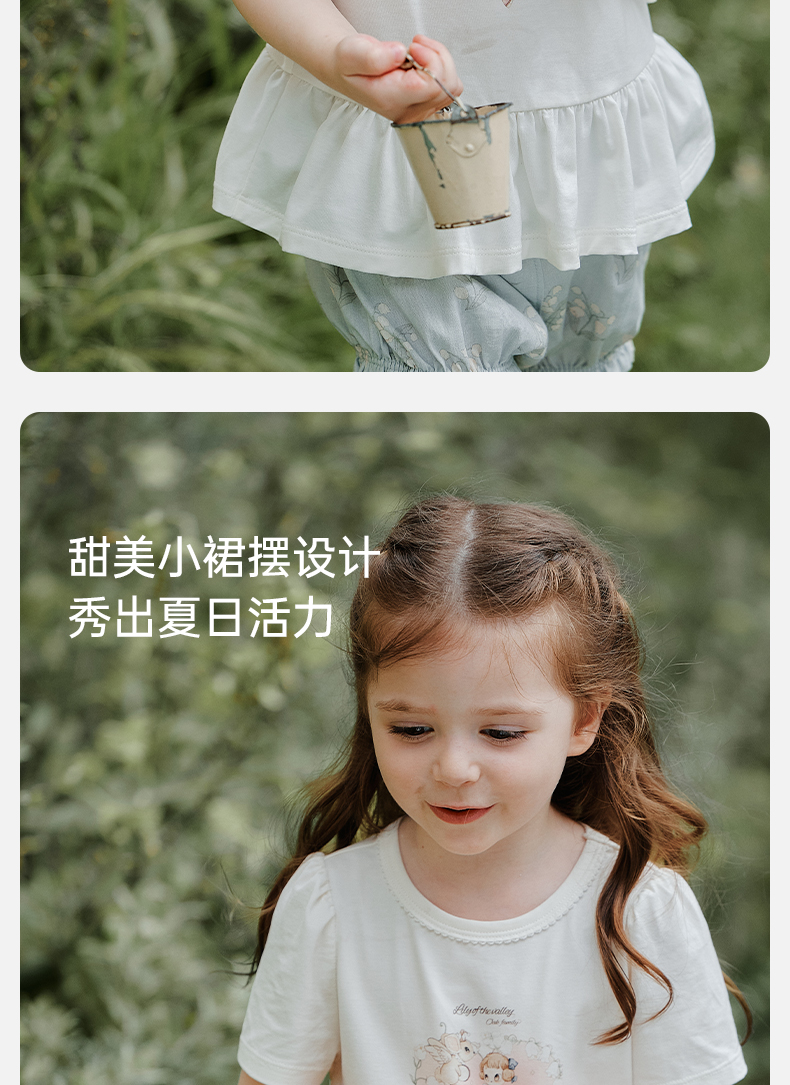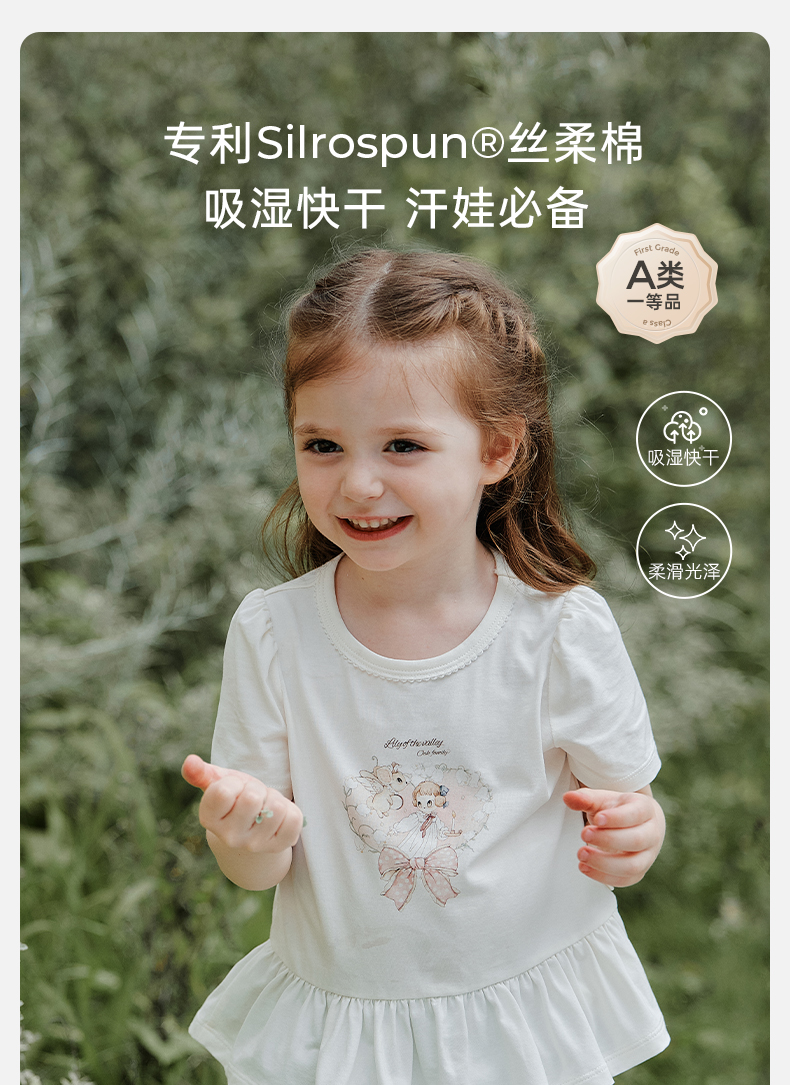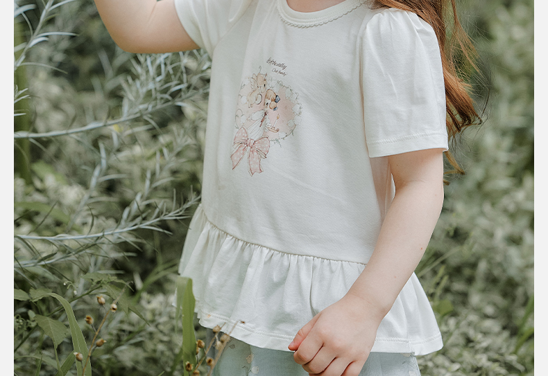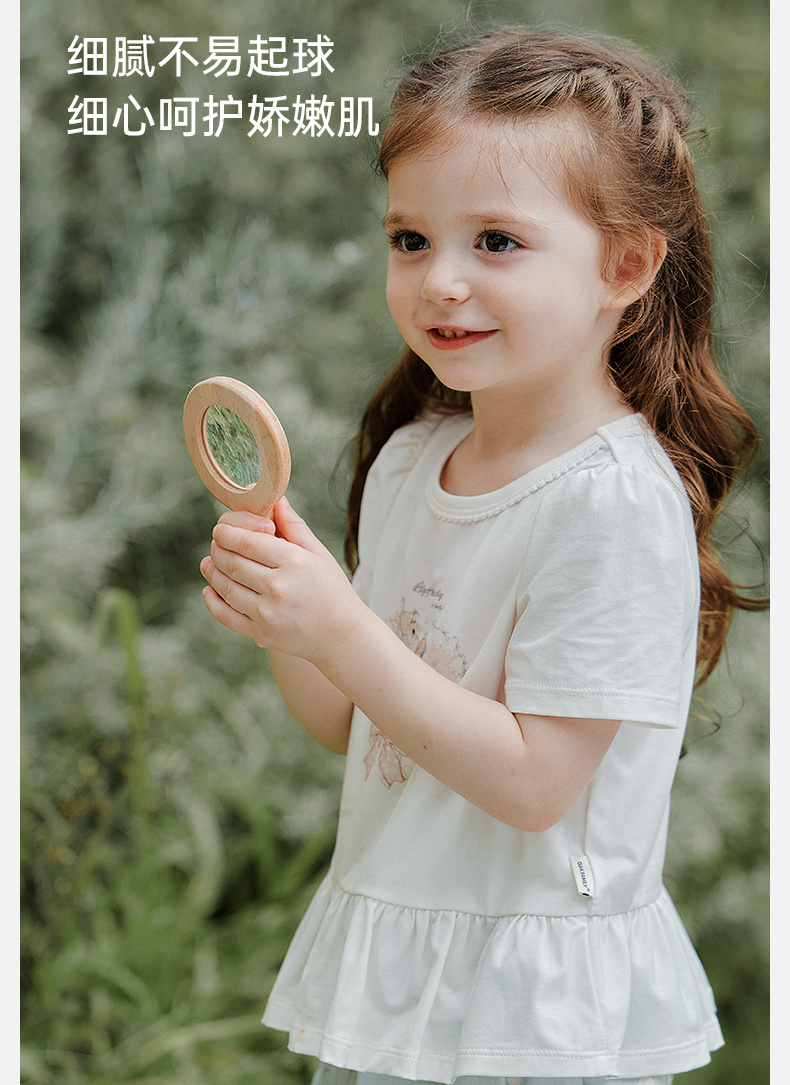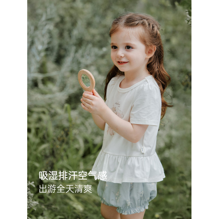 Oak Family夏季女童T恤絲柔棉圓領短袖打底衫百搭花邊彈力上衣