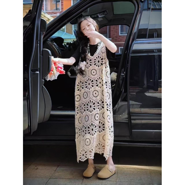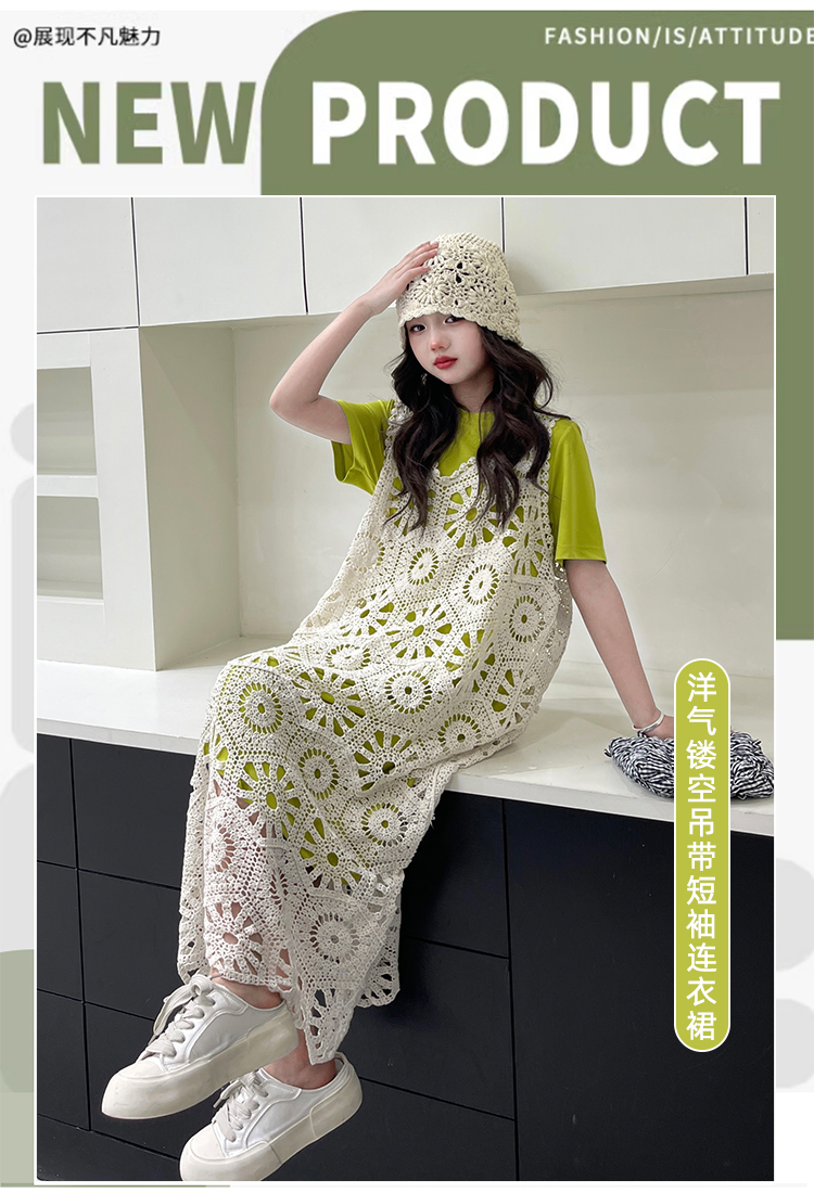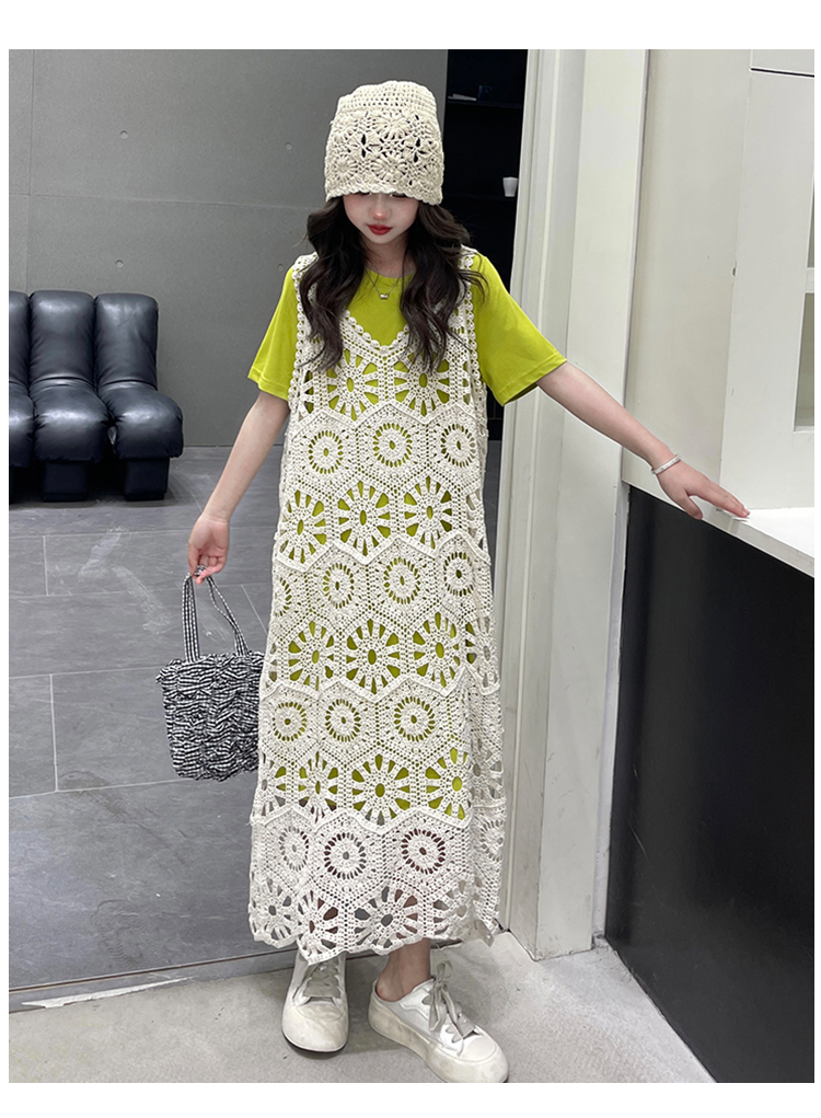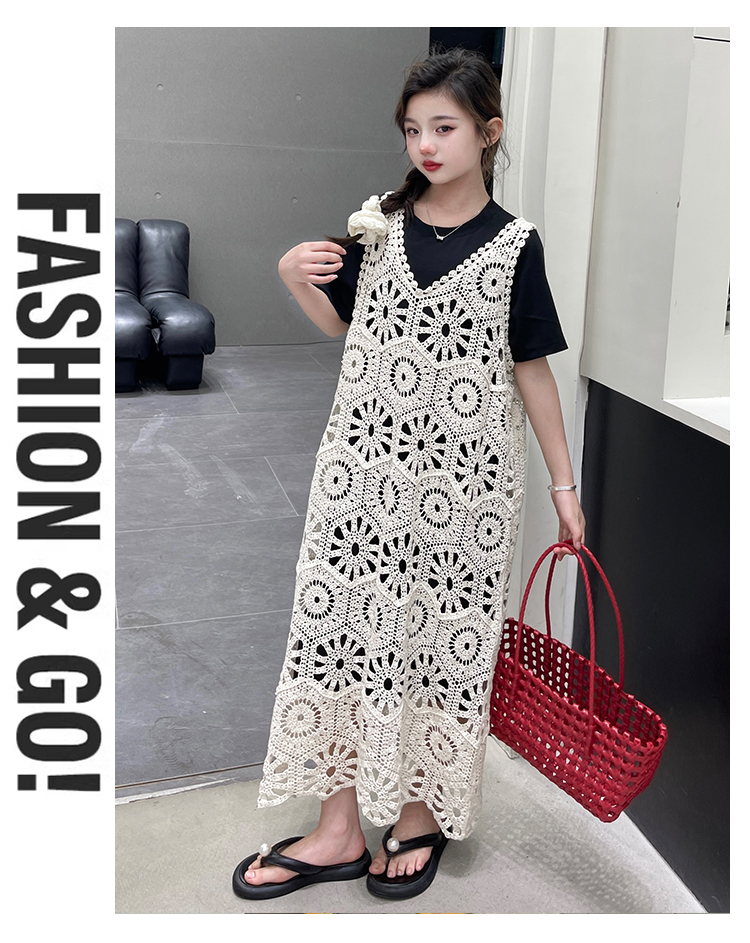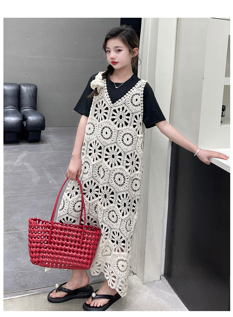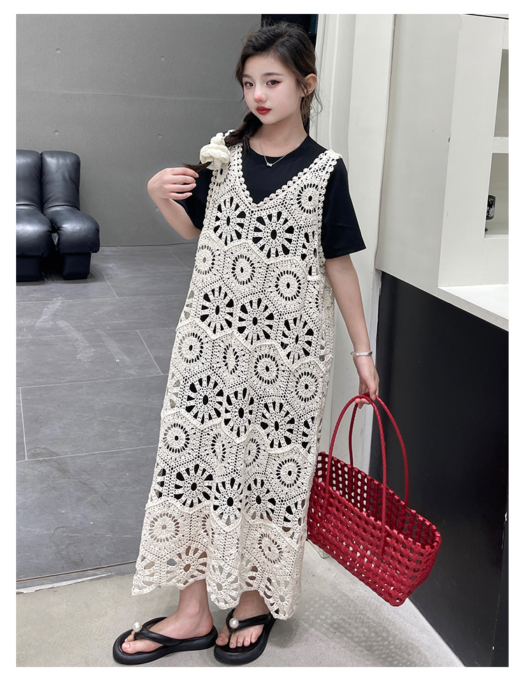 今年流行鏤空曡穿連衣裙女童夏季薄款學院度假出遊高級感針織長裙