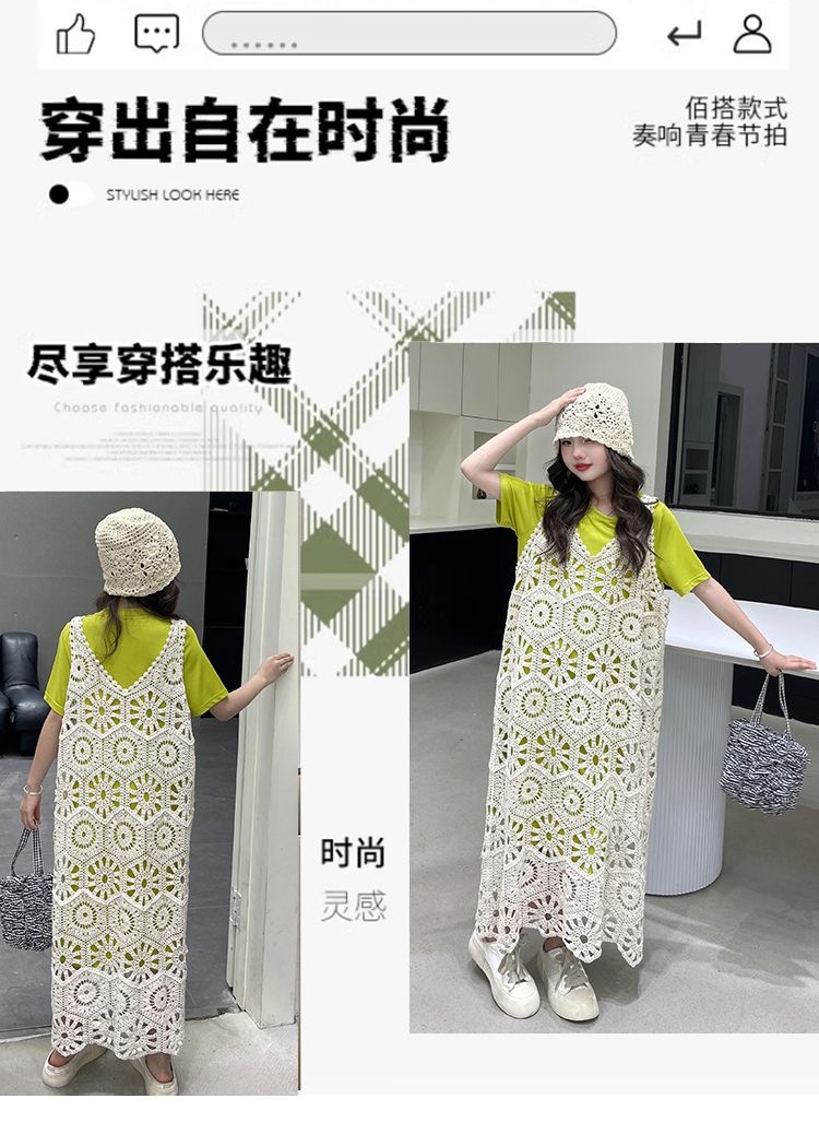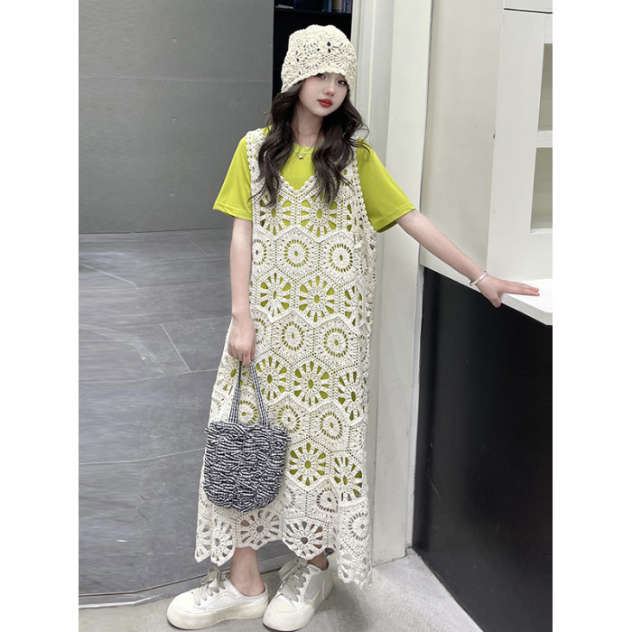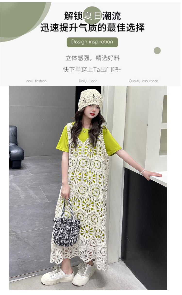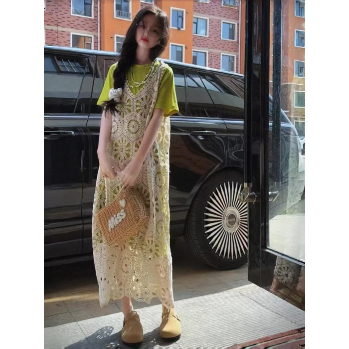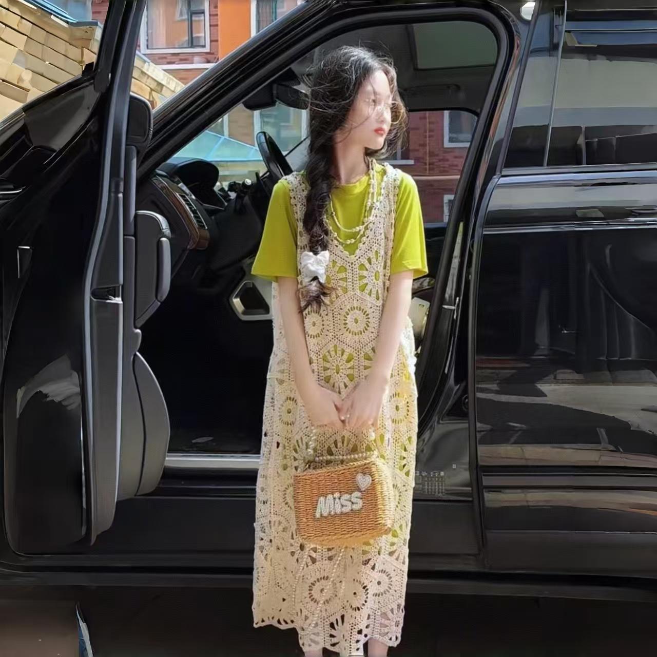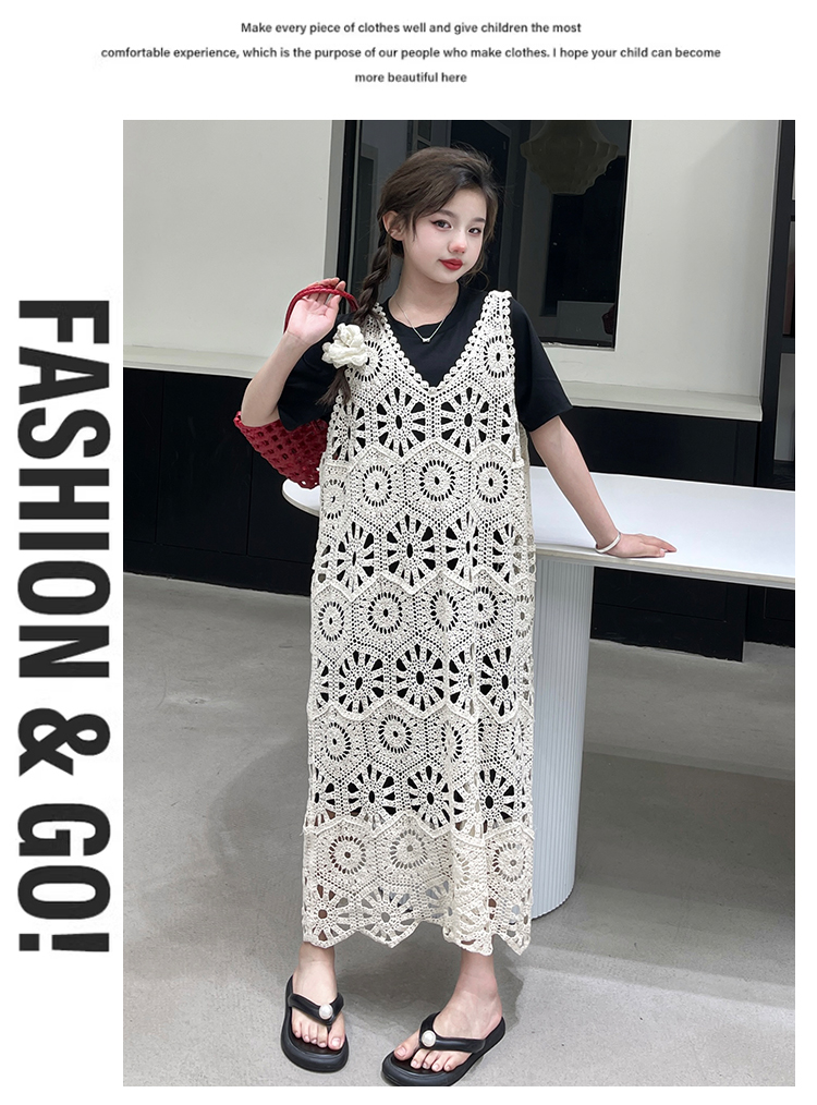 今年流行鏤空曡穿連衣裙女童夏季薄款學院度假出遊高級感針織長裙