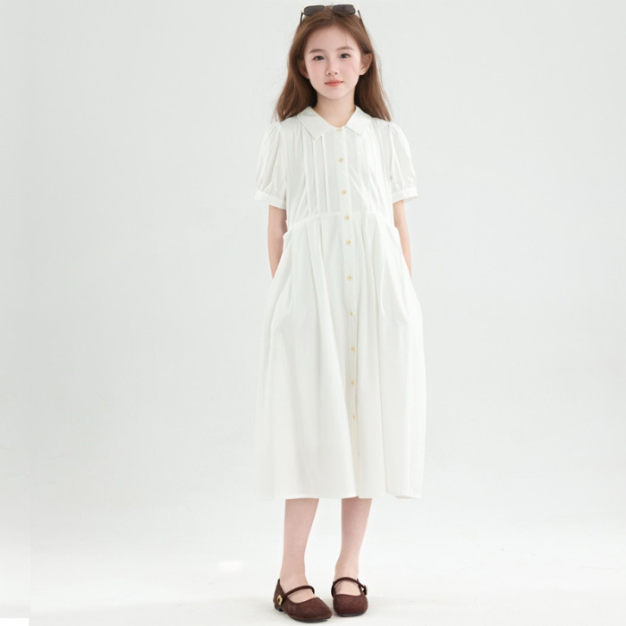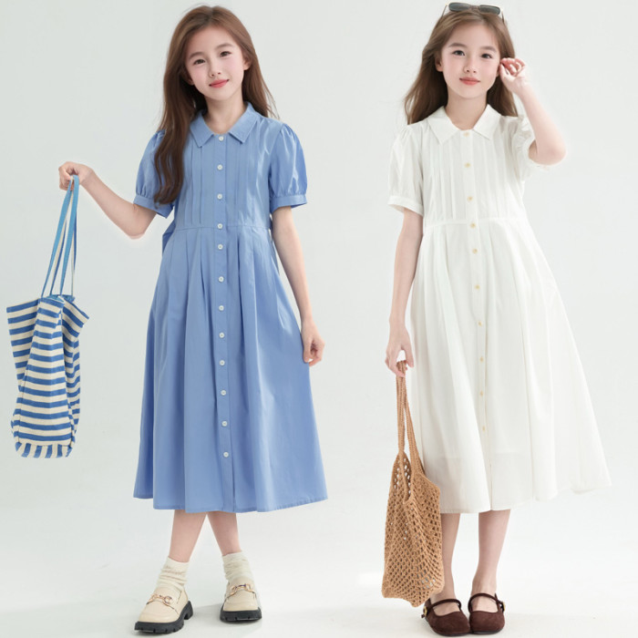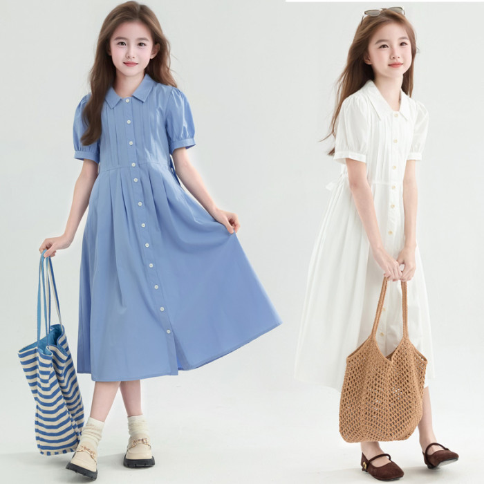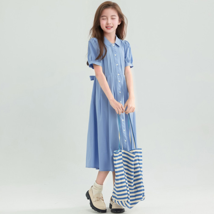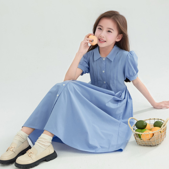 夏季女童法式藍色長款立領襯衣裙 童裝新品短袖連衣裙 中大兒童