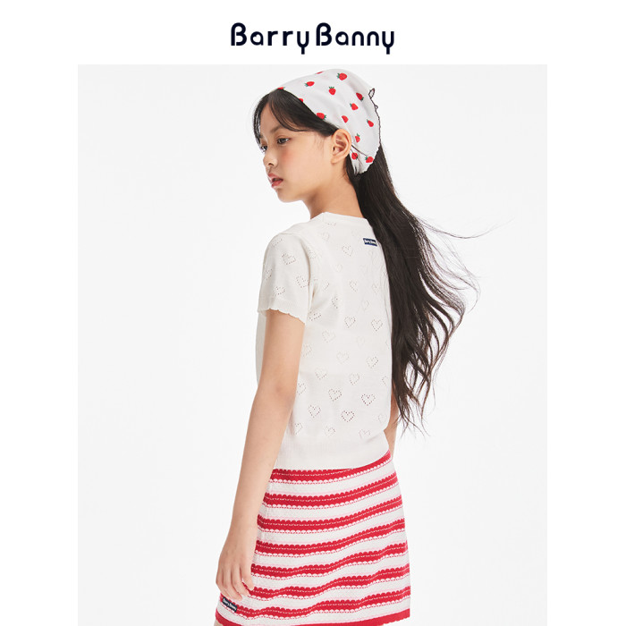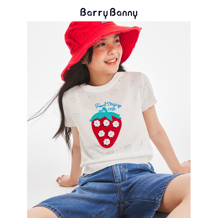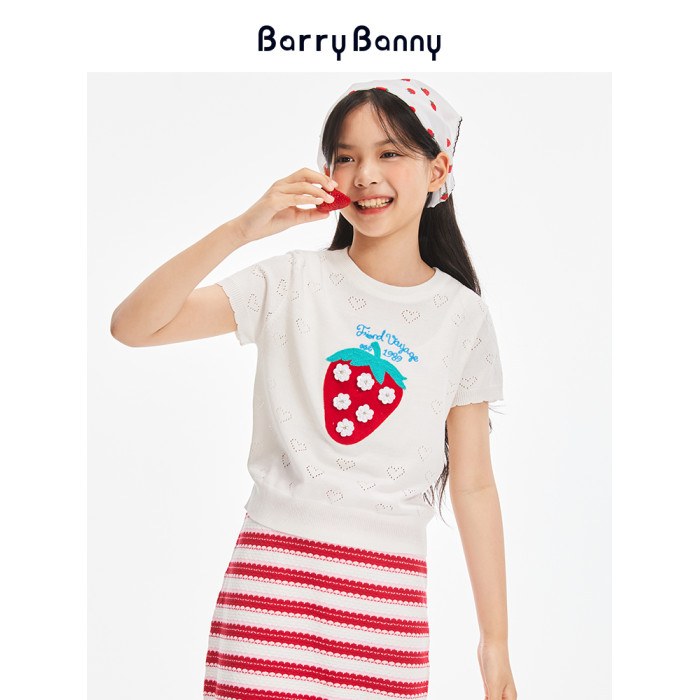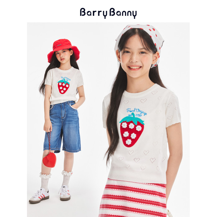 BarryBanny中大女童草莓T恤2025夏季新款圓領短袖兒童印花白上衣
