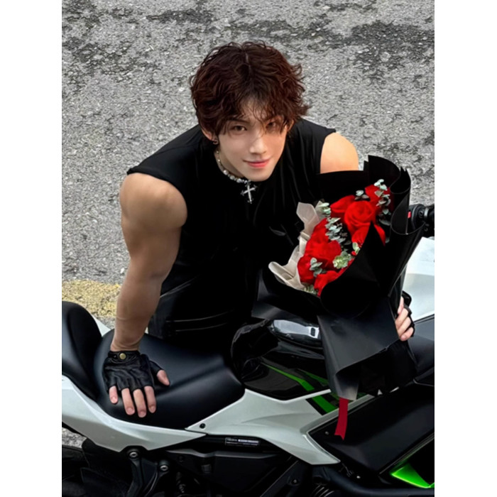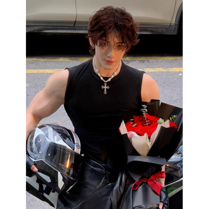 高級美式高街無袖背心男士痞帥機車風黑色運動t恤夏季百搭上衣男