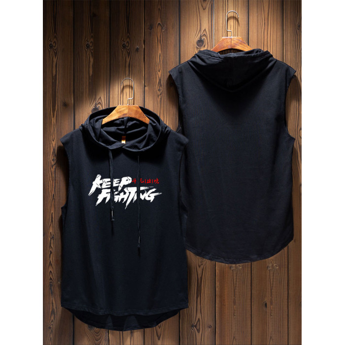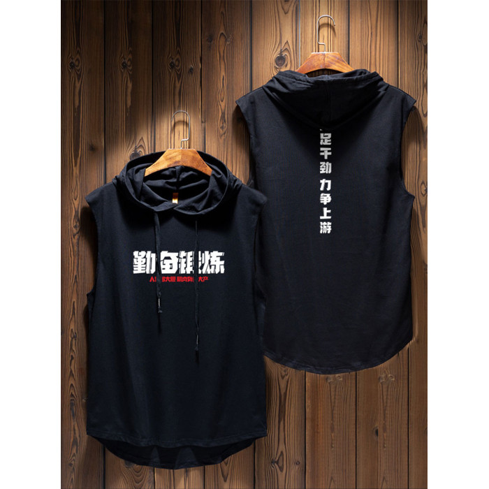 灰色【勤奮鍛鍊 連帽背心】 白印花
