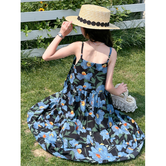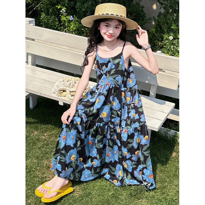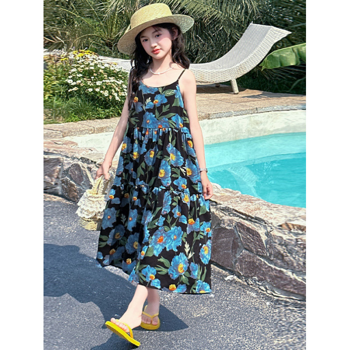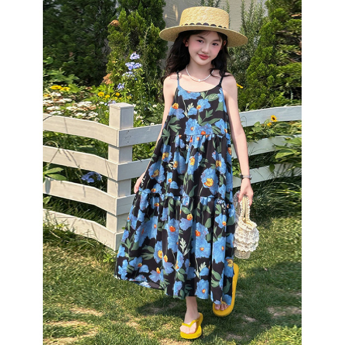 女童連衣裙夏季2025新款洋氣兒童碎花公主裙大童海邊度假風吊帶裙