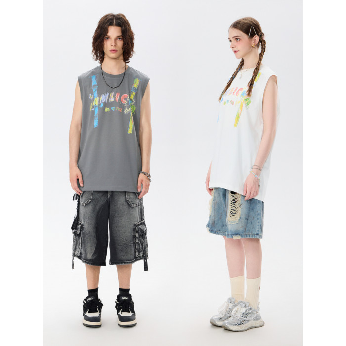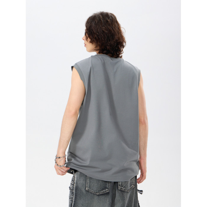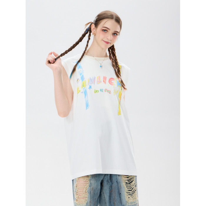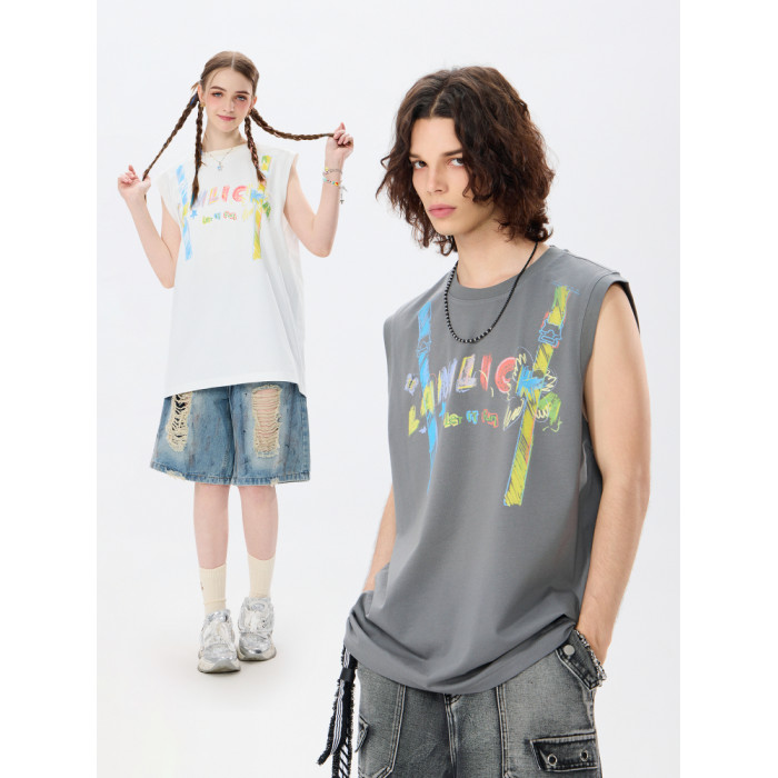 LAMLICKA灰色美式背心女潮牌夏季寬松無袖白色純棉坎肩上衣t恤女