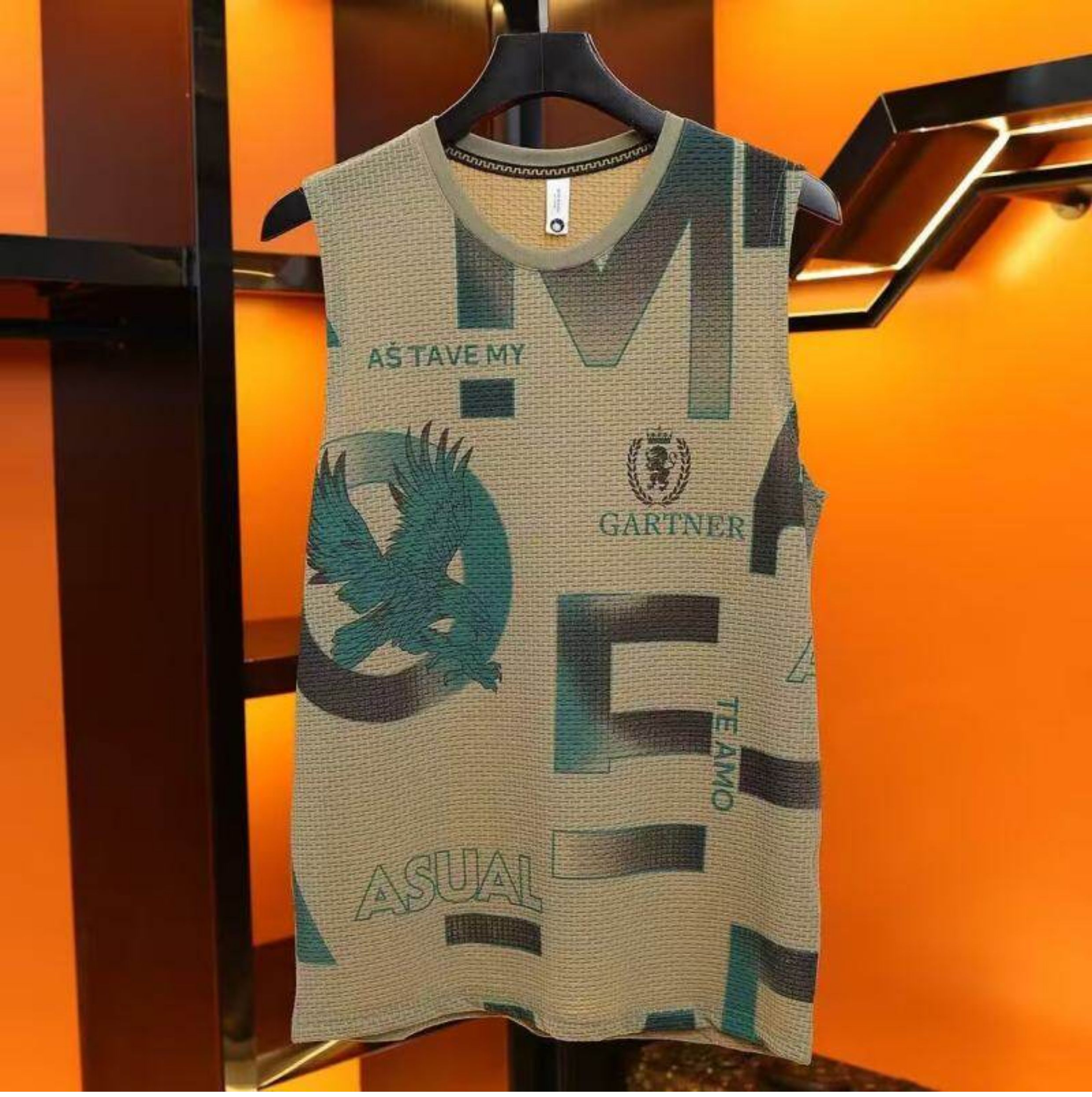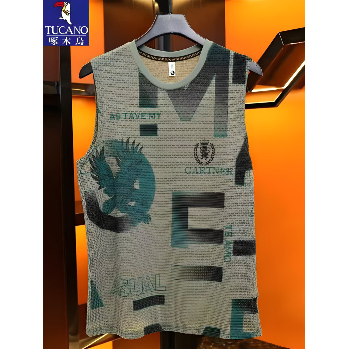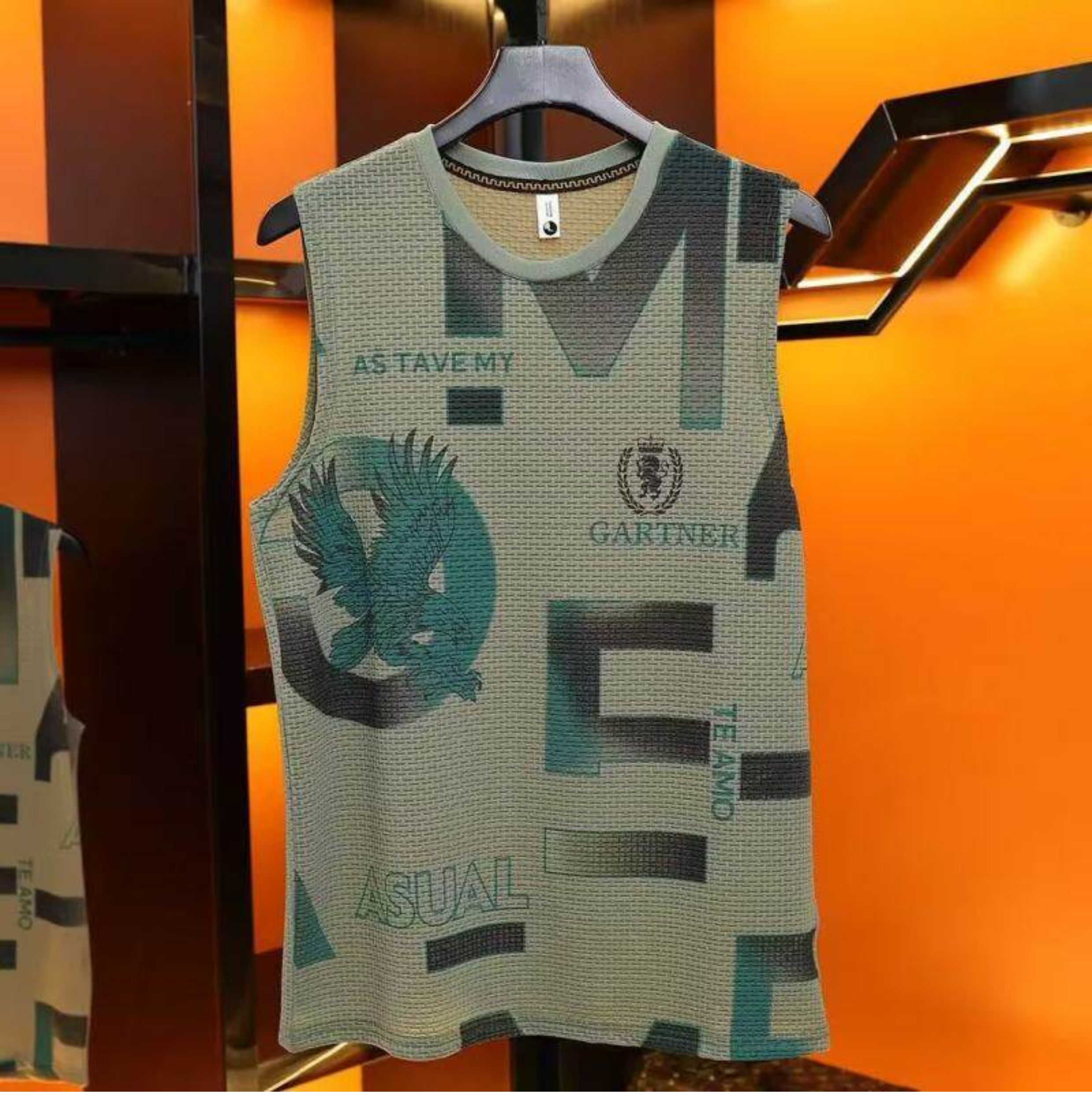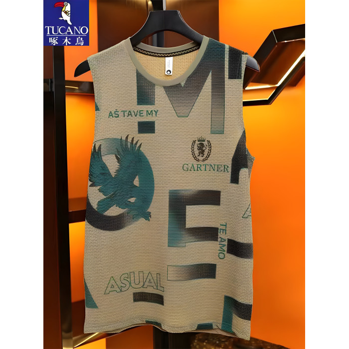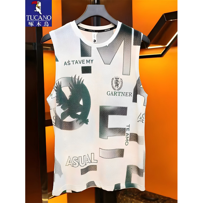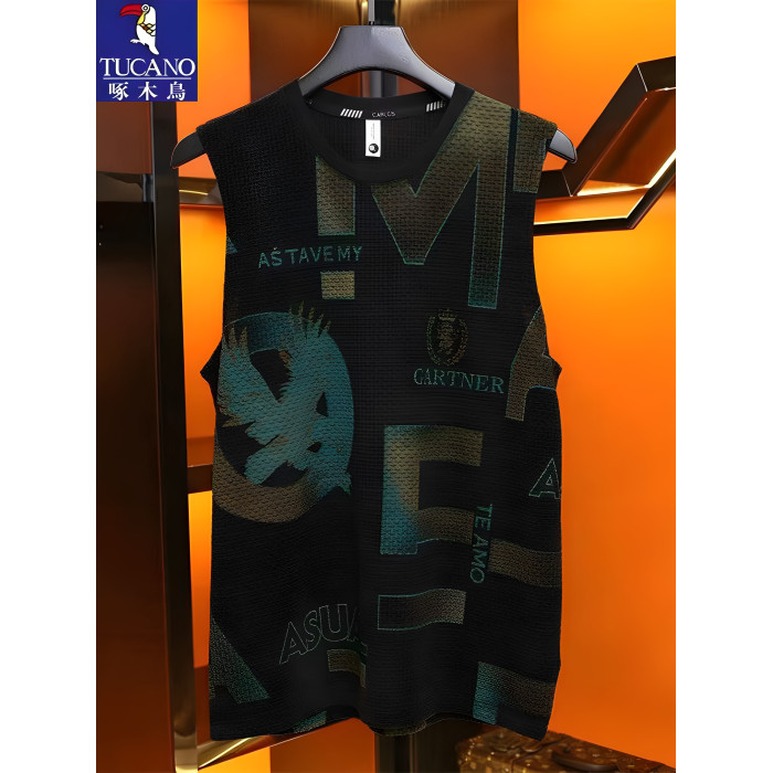 啄木鳥男夏新款冰絲背心印花圓領無袖上衣彈力運動坎肩大碼速乾