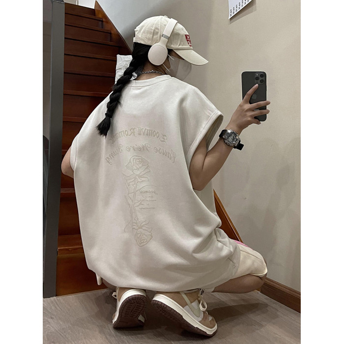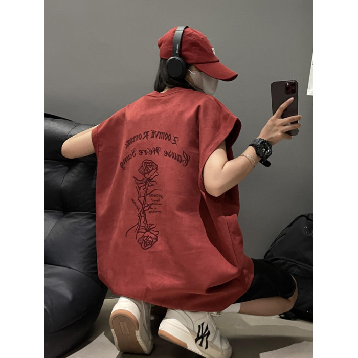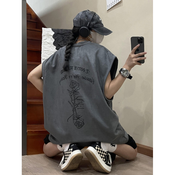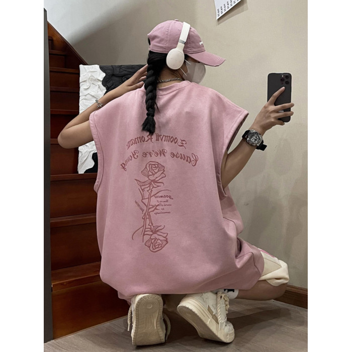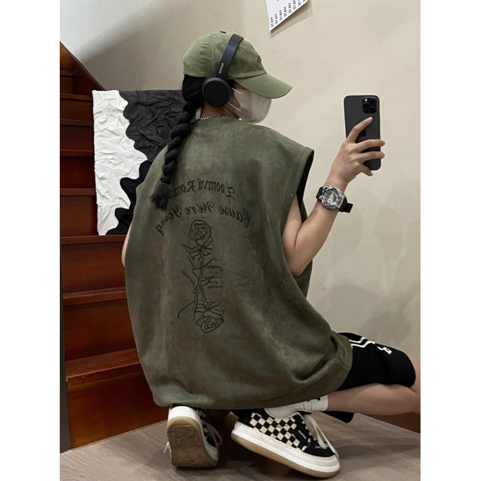 美式麂皮絨粉色背心男運動寬松無袖t恤夏季潮牌痞帥坎肩2025新款