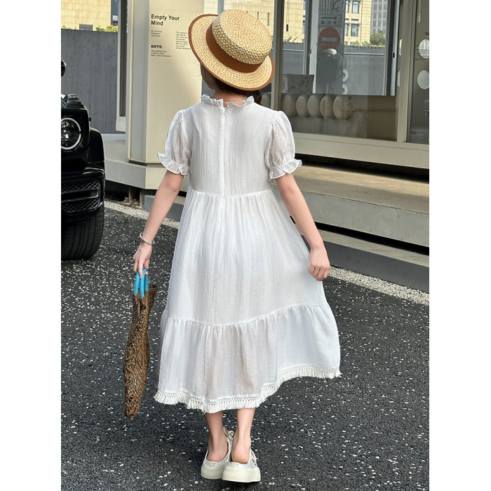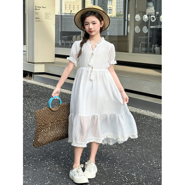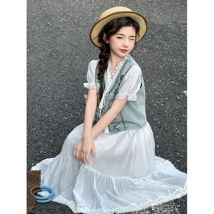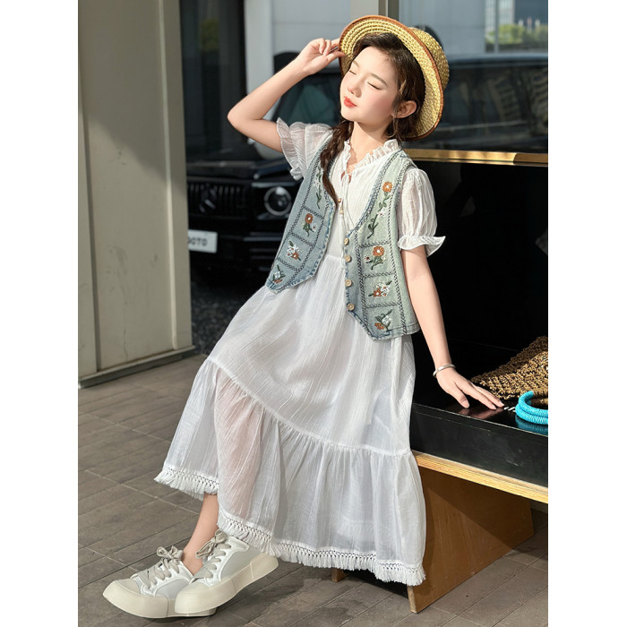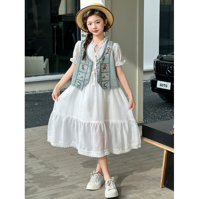 女童夏季連衣裙洋氣女孩大童刺綉牛仔馬甲休閒波西米亞流蘇裙夏款