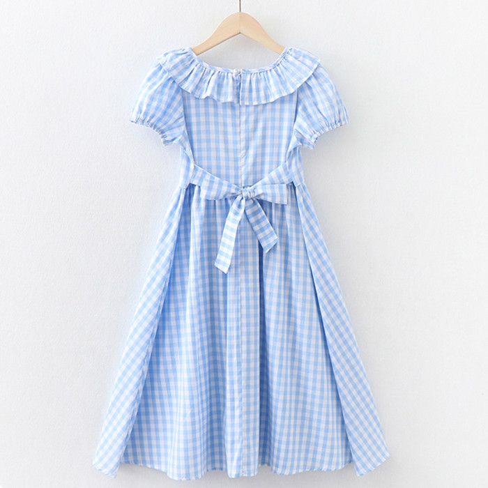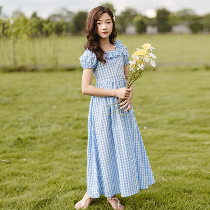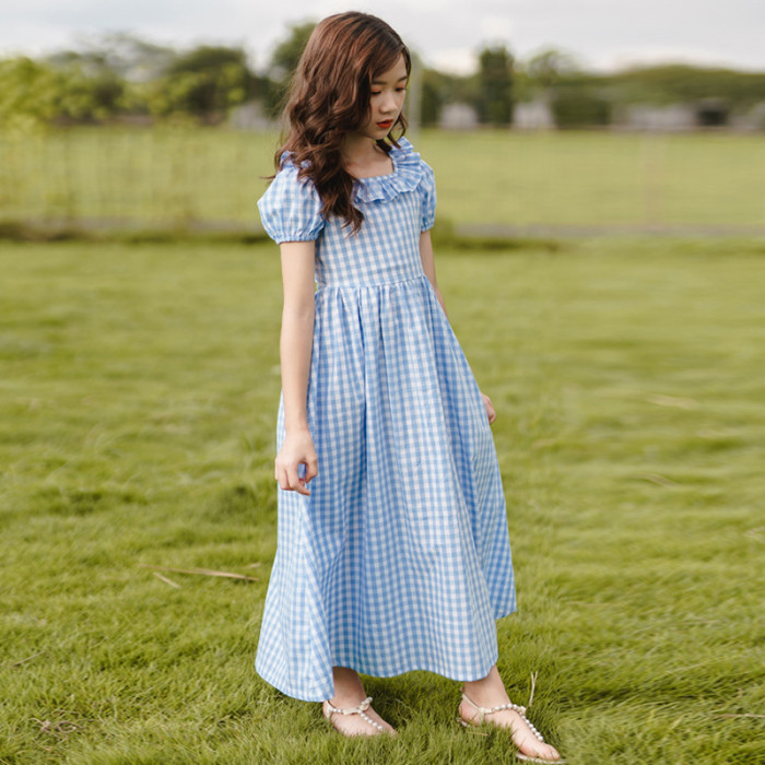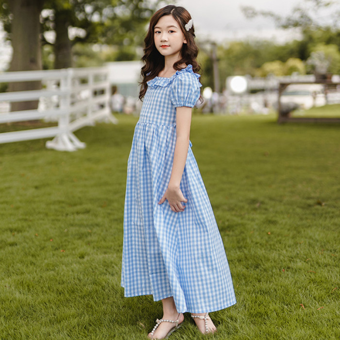 女童連衣裙夏季中大童格子收腰過膝長裙兒童純棉公主裙子薄款夏裝