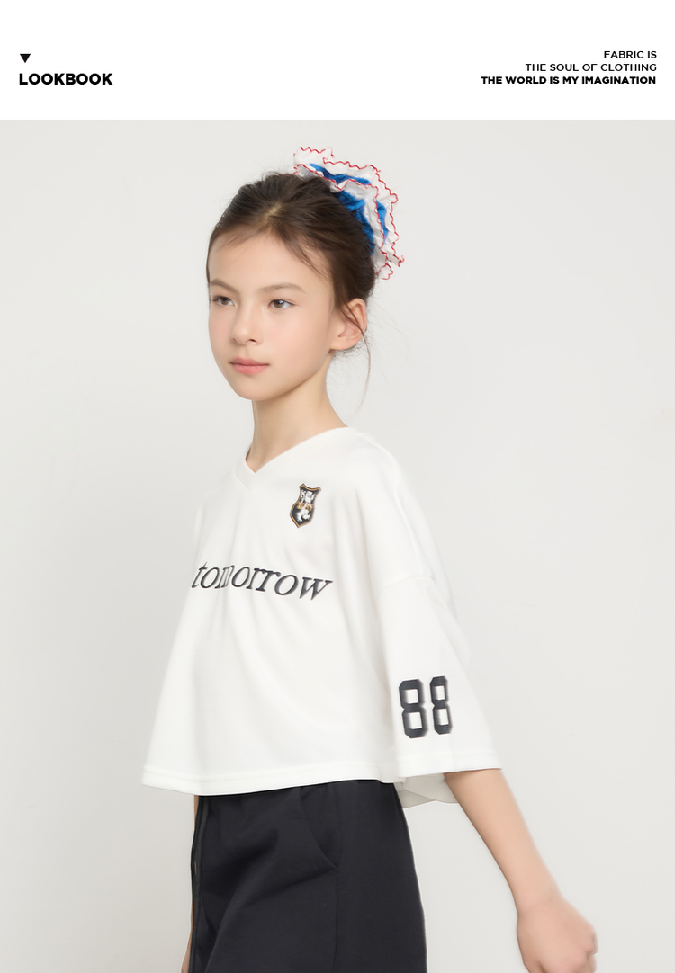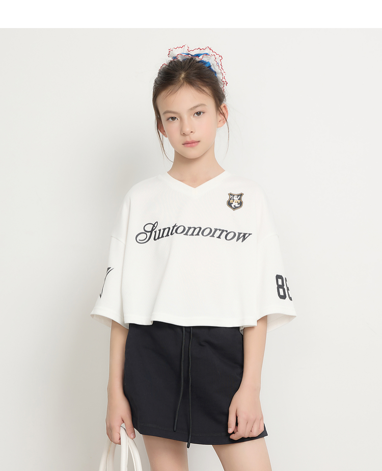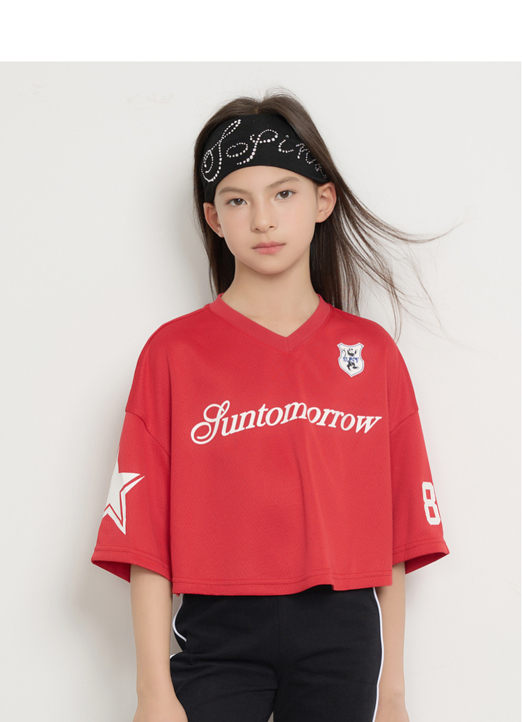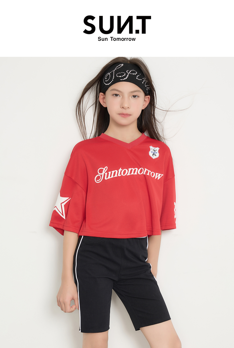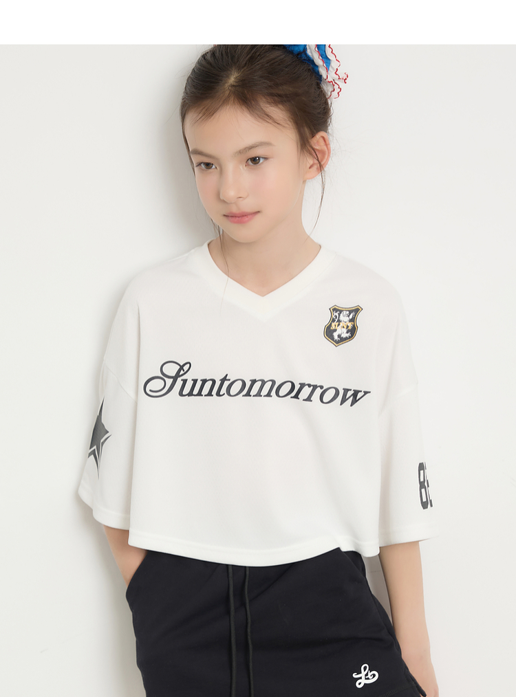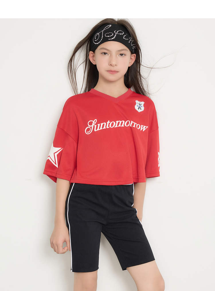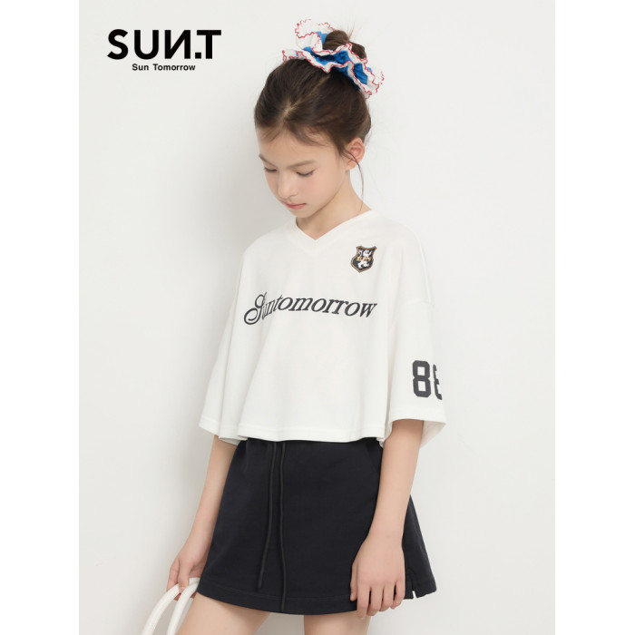 suntomorrow童裝V領短袖印花T恤女童夏季運動風寬松短款休閒上衣