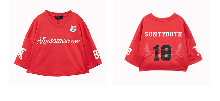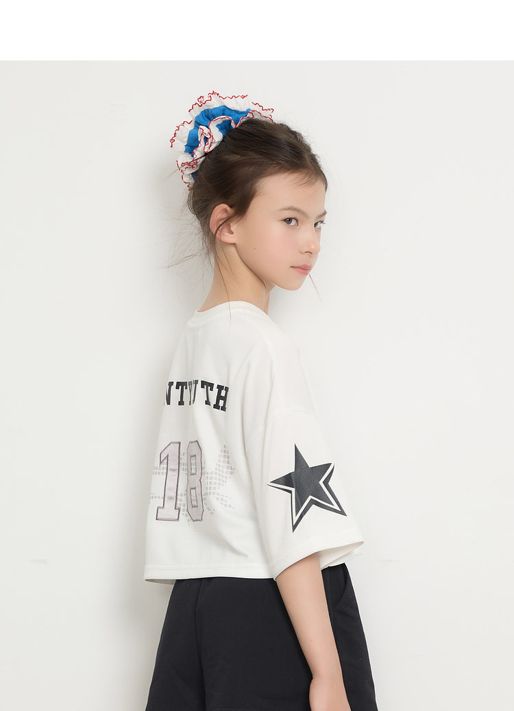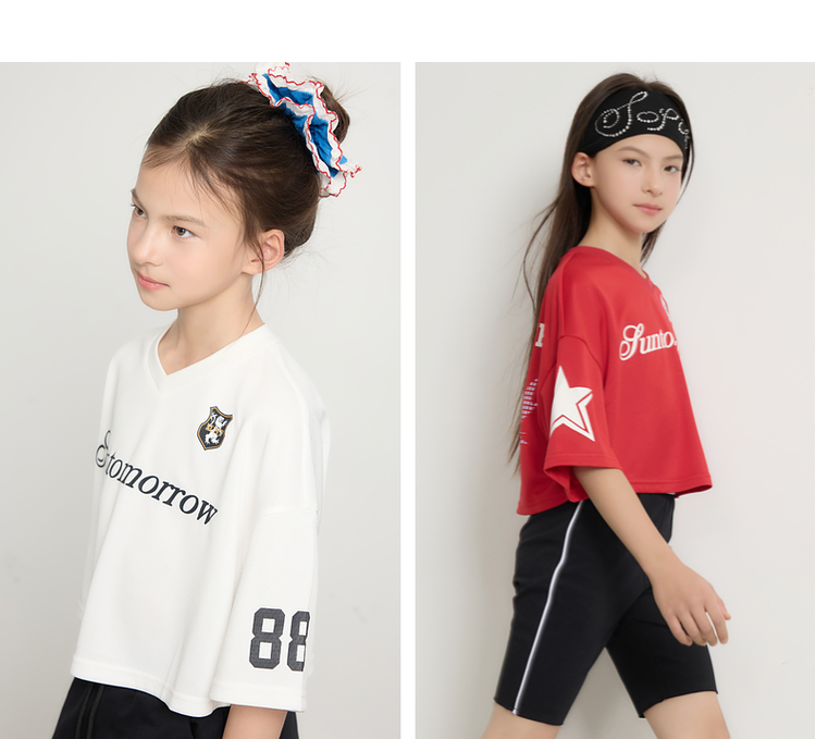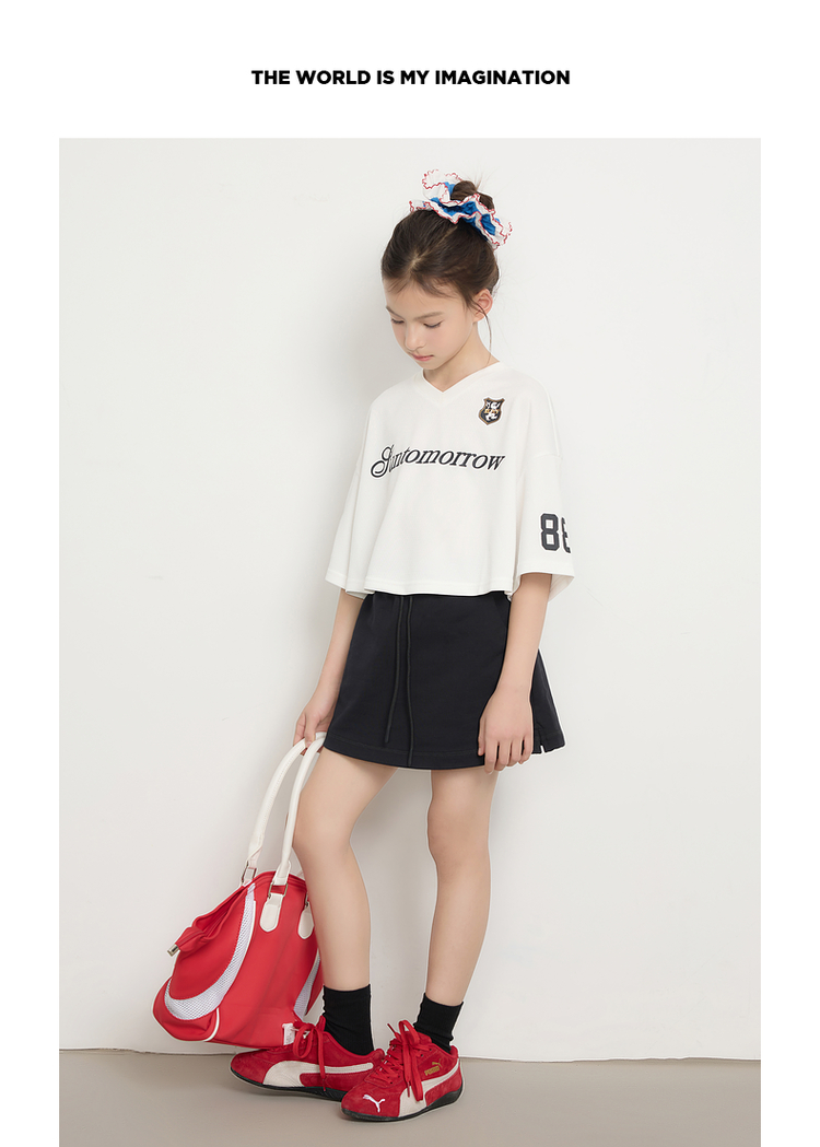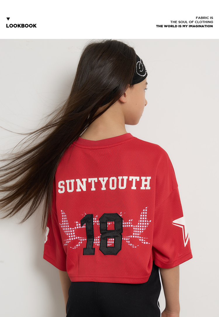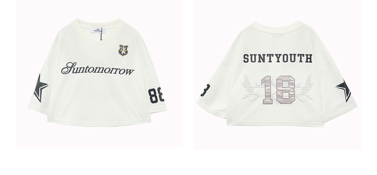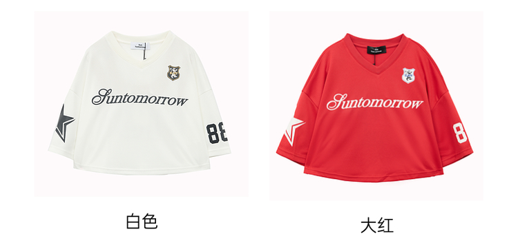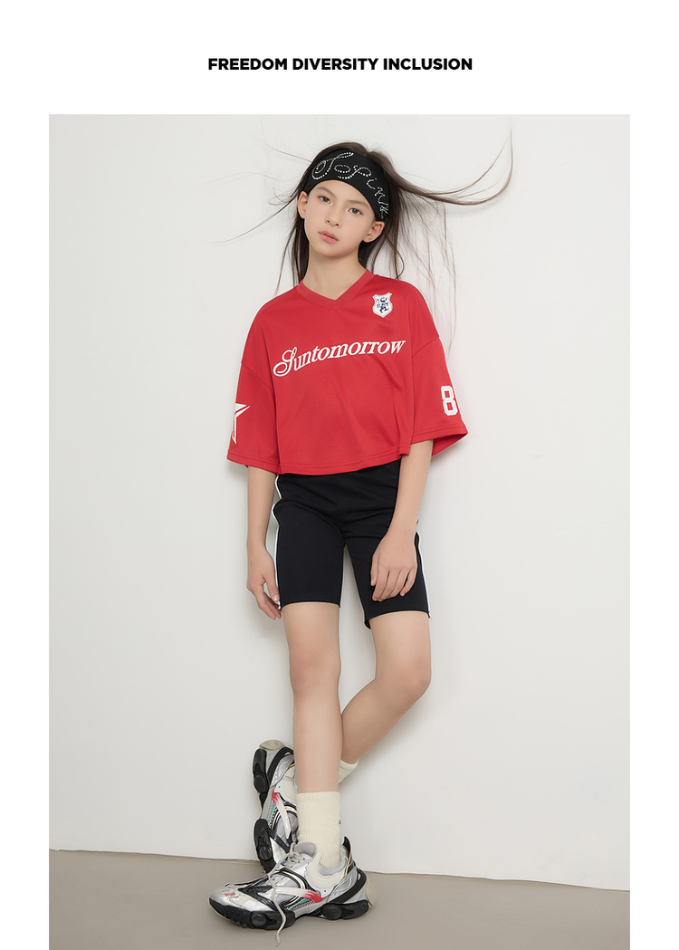 suntomorrow童裝V領短袖印花T恤女童夏季運動風寬松短款休閒上衣