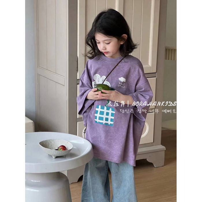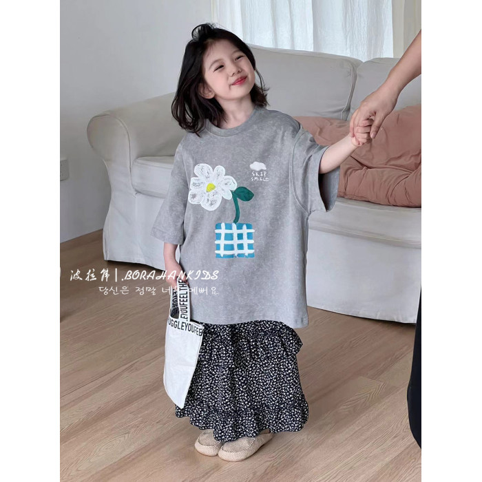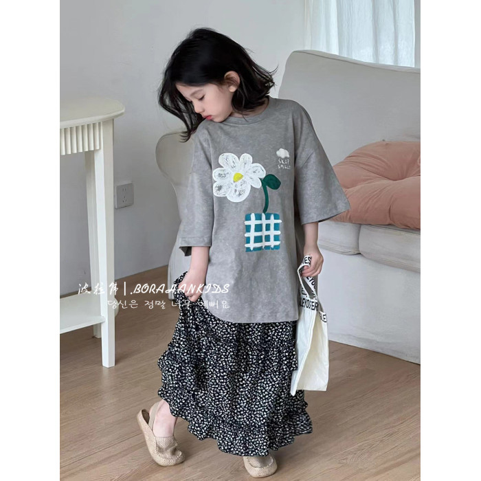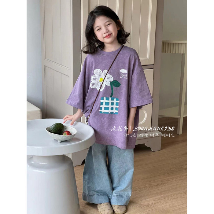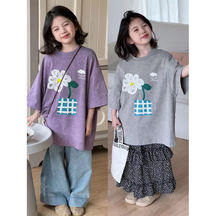 女童花朵短袖夏天兒童印花T恤2025小女孩套頭體恤中大童洋氣t上衣